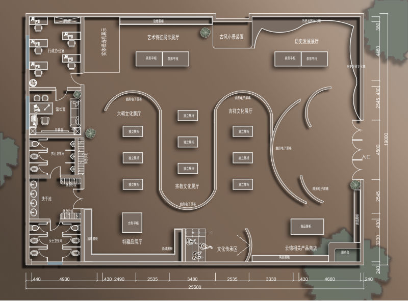(1)主入口:主入口的设计将具有中式风格的图案与现代几何线条相结合,并充分运用数字媒体技术。运用曲线型的电子屏幕,屏幕中以白色作为背景,突出中间的中国古代绘画图案以及展馆的展示主题——南京云锦,图案的造型模拟绸缎的形式,灵活地与云锦艺术相结合,再搭配具有中式风格的植物小景,更加具有东方韵味,丰富展馆空间的内容,让观者一进入大门就能够沉浸于历史的气息当中。同时灯具的造型运用多个同心圆形的形式,增加空间层次,并结合中式山水的图案呈现。