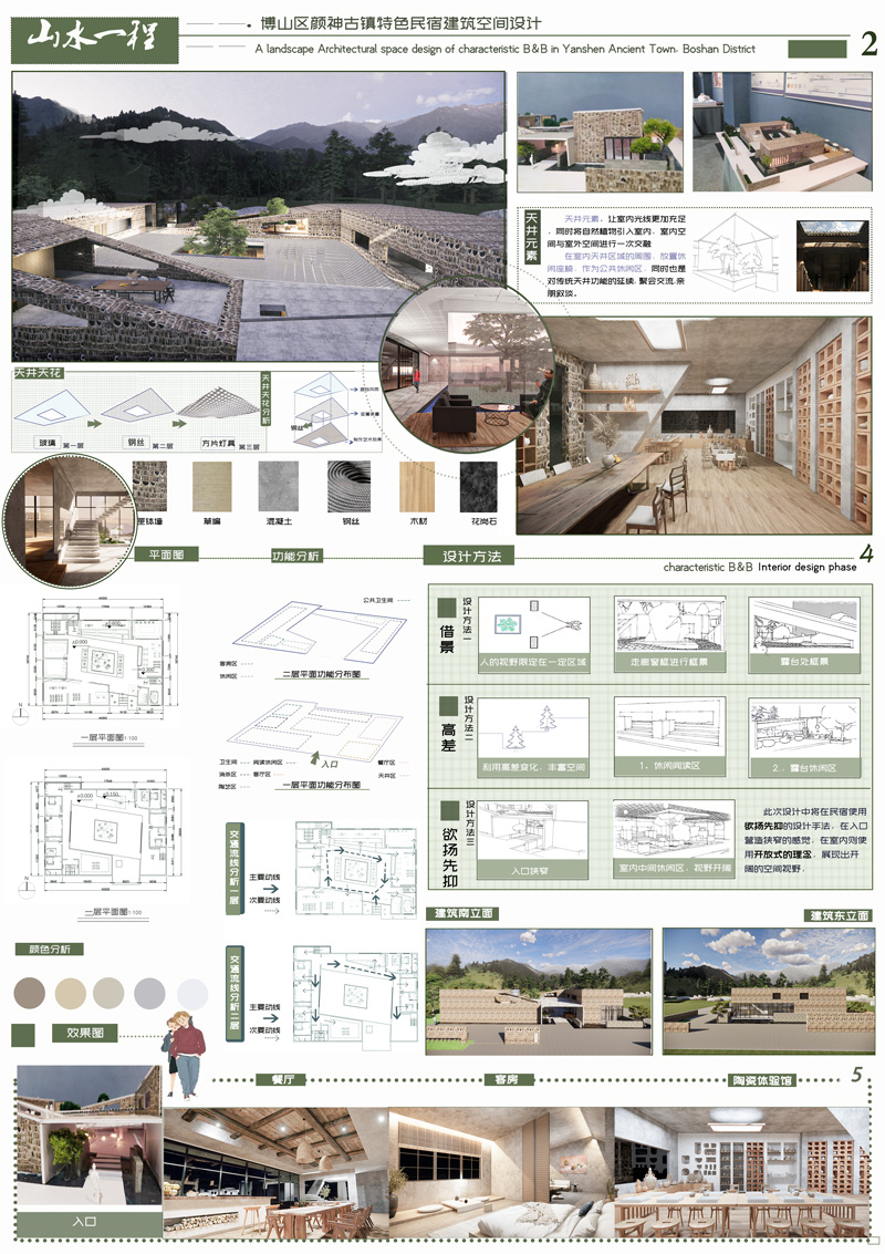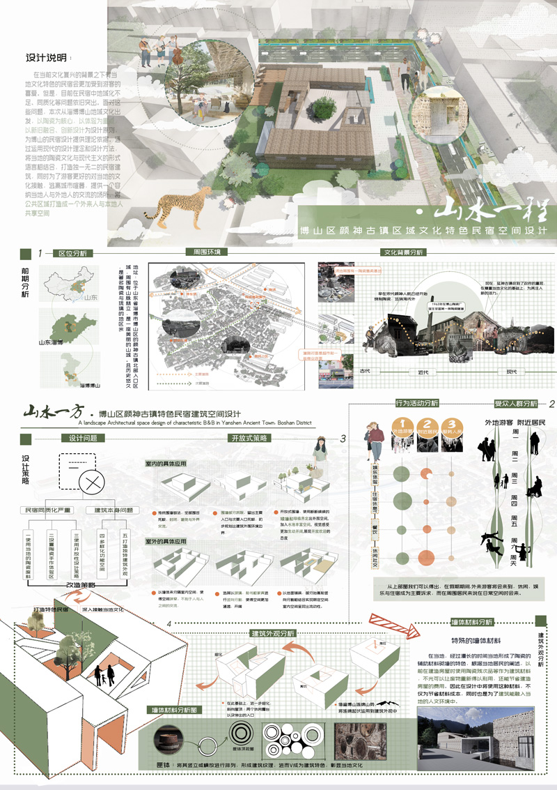 淄博博山陶瓷主题民宿即以博山陶瓷文化为主题,围绕着陶瓷文化而展开的设计,集娱乐、文化体验、住宿、于一体的综合性功能空间。此次设计实践旨在将淄博博山陶瓷文化凝练为可应用于民宿中的设计元素,通过将陶瓷废弃材料与现代的设计理念和设计形式相结合,运用于陶瓷主题民宿室外内的设计中,营造出极具地域特色的博山陶瓷文化空间氛围,打破周围酒店民宿的同质化现象,激发周围空间的活力,扩大颜神古镇的影响力,带动周围经济发展。