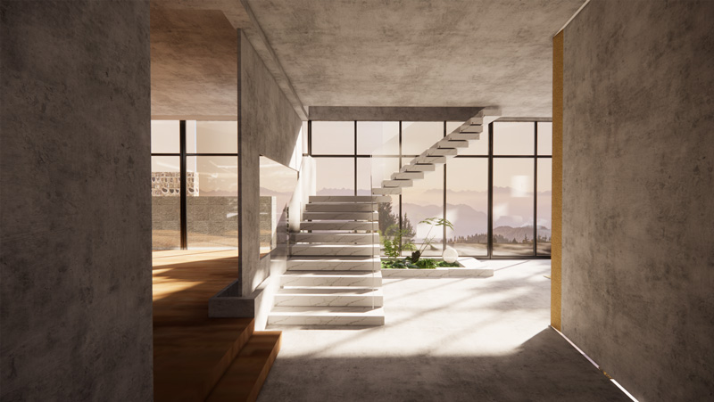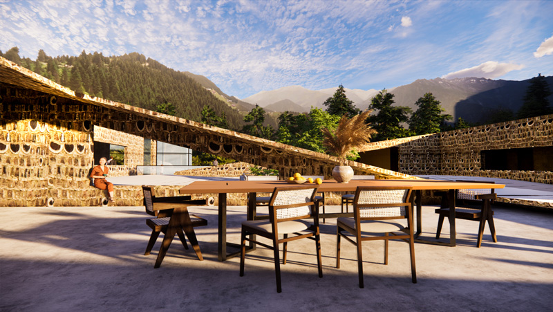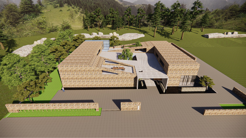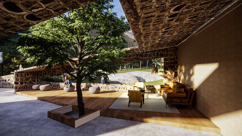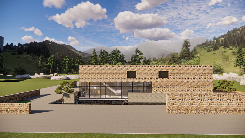 民宿的建筑外观灵感来源于博山周围连绵起伏的山势,基于现代主义的简洁形式语言下对山体形势走向进行抽象化处理。建筑周围放置水池,形成所谓“山一程,水一程”的意像。民宿的建筑材料选用当地的建筑材料,陶瓷废弃材料,草编,木材等,同时也对现代的钢筋混凝土材料加以利用,体现出新旧结合和可持续的设计原则,同时更好满足当代人的需求。遵循着开放式的设计理念,在建筑旁筑以围墙,通过使用玻璃材料与外部空间交融,以断断续续的矮墙和水池来划定建筑的庭院空间范围,呈现敞开式的视觉感受。