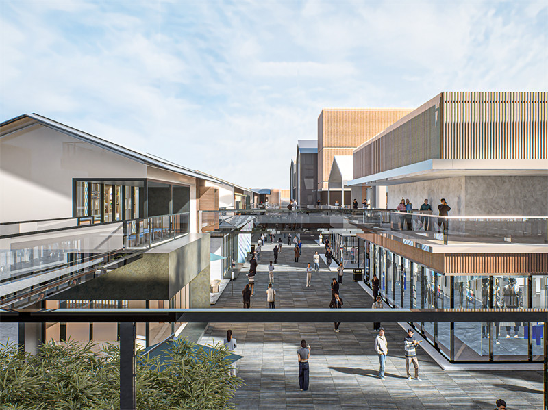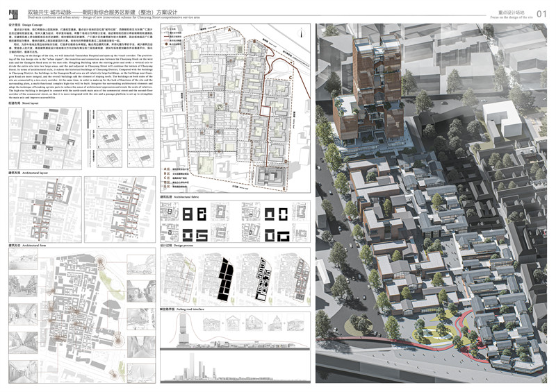 空间组织:将重点设计场地西侧的老城区的城市肌理进行提炼并将其延伸至设计场地,与创造的轴线一起组织交织成新的城市动脉,置入文化商业慢行街,激活城市活力。将原本城市文化道路进行改造,置入性功能,打造活力路线,创造联通场地东西的道路,增加设计片区内的可达性。
