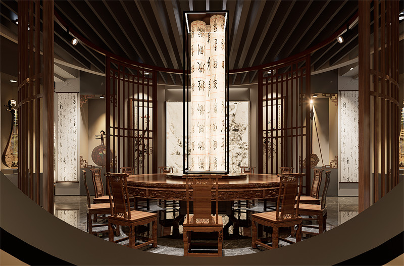 互动体验区特别配置了宽敞的大圆桌,既可供游客休憩交流,又可成为书法爱好者与青少年进行书法技艺交流与探讨的理想场所。新中式风格的对坐桌椅为游客提供了亲身体验书法的绝佳环境,配合专业讲解员的悉心指导,有效推动了书法艺术的普及与传承,激发了更多人对书法艺术的热爱与探索。