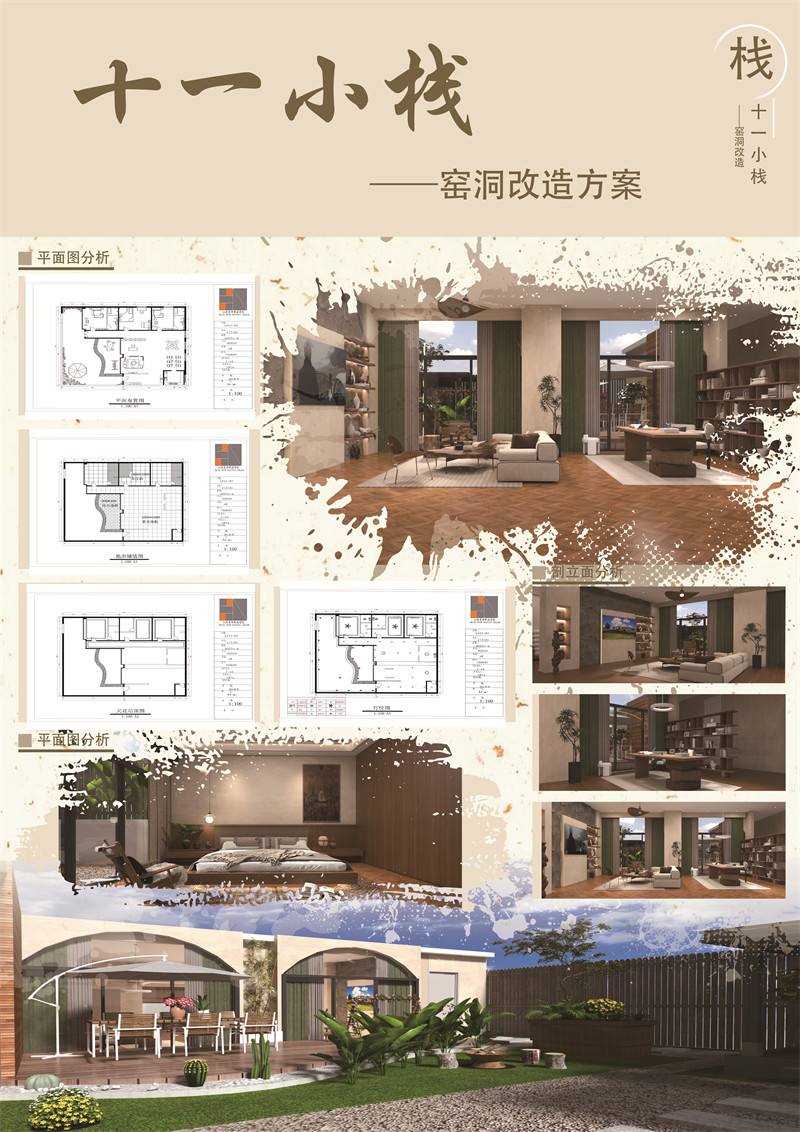 十一小栈是在山西特色建筑“窑洞”的基础上进行改造,窑洞是中国北部黄土高原上居民的古老居住形式。在建筑学上属于生土建筑,其特点就是人与自然和睦相处、共生,简单易修、省材省料,坚固耐用,冬暖夏凉。传统的窑洞空间从外观上看是圆拱形,虽然很普通,但是在单调的黄土为背景的情况下,圆弧形更显得轻巧而活泼,这种源自自然的形式,不仅体现了传统思想里天圆地方的理念,同时更重要的是门洞处高高的圆拱加上高窗,在冬天的时候可以使阳光进一步深入到窑洞的内侧,从而可以充分的利用太阳辐射,而内部空间也因为是拱形的,加大了内部的竖向空间,使人们感觉开敞舒适。窑洞冬暖夏凉,住着舒适,节能,同时传统的空间又渗透着与自然的和谐,朴素的外观在建筑美学上也是别具匠心。但是随着经济的发展,窑洞的废弃越来越多,有不少人儿时窑洞的记忆逐渐消散,十一小栈就是想在窑洞这个载体上进行更为人性化,现代化的改造,从而提升窑洞的美观,但保留窑洞这种传统建筑形式,让更多人记住我们的传统文化,记住曾经的记忆。窑洞最大的缺点就是采光不足,我把整个向阳面全部由原先的泥砖结构改为落地玻璃,这样充分接纳了阳光,小院内多种植绿植,与自然亲近,十一小栈就是一个完全符合当代人生活习性的“世外桃源”