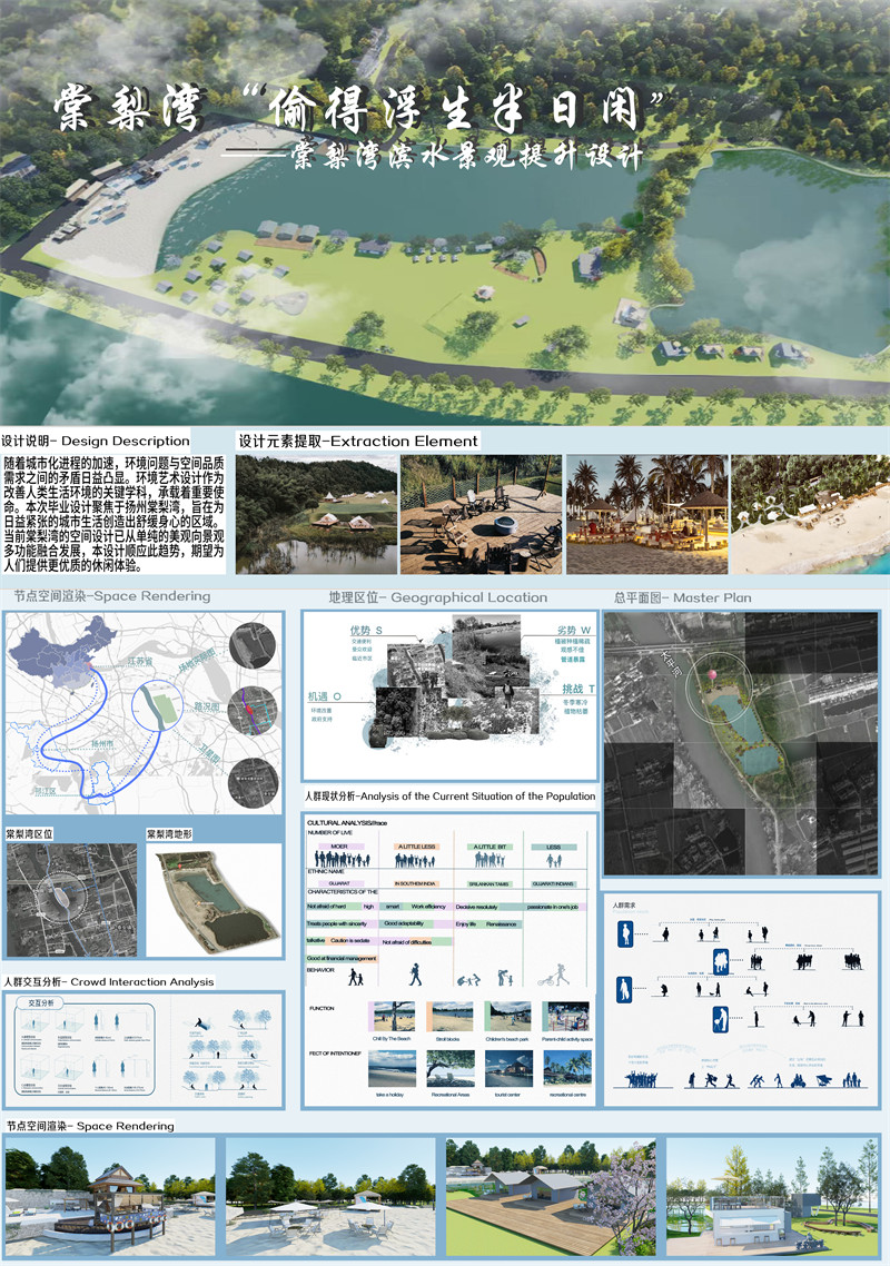 随着城市化进程的加速,环境问题与空间品质需求之间的矛盾日益凸显。环境艺术设计作为改善人类生活环境的关键学科,承载着重要使命。本次毕业设计聚焦于扬州棠梨湾,旨在为日益紧张的城市生活创造出舒缓身心的区域。当前棠梨湾的空间设计已从单纯的美观向景观多功能融合发展,本设计顺应此趋势,期望为人们提供更优质的休闲体验。