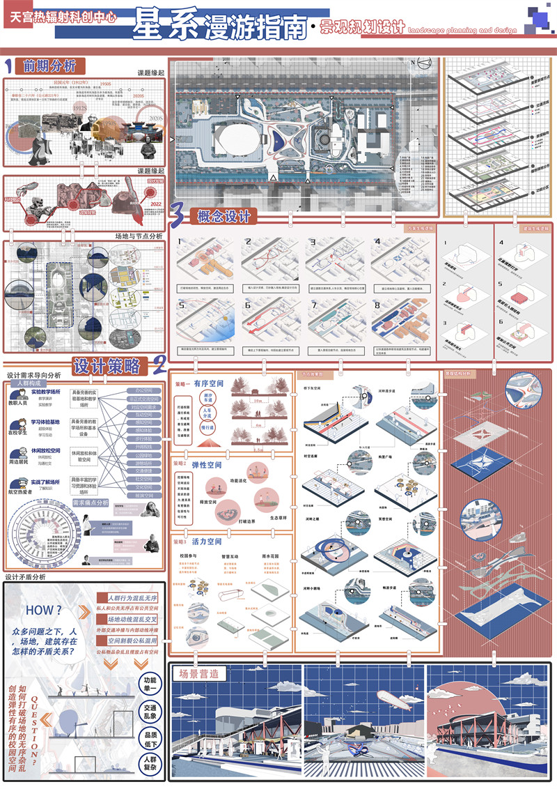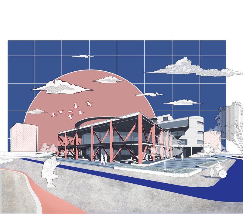 本次课题对艺术楼的建筑外形进行相应改造,涉及外形上的材料、色彩装饰造型进行了重新选择与利用;然后对内部空间进行相应的艺术设计。重新划分了内部空间的总体布局,重新定义了内部空间的适用人群,选取了航天、科技相关的元素内容,利用了高科技创新性产品。设计总占地面积约2400平方米,总建筑面积约9000平方米。本次课题通过多元化的设计手法以及独特的数字表现形式将太空探索带来的热点影响将艺术楼改造为大学生综合科创中心。