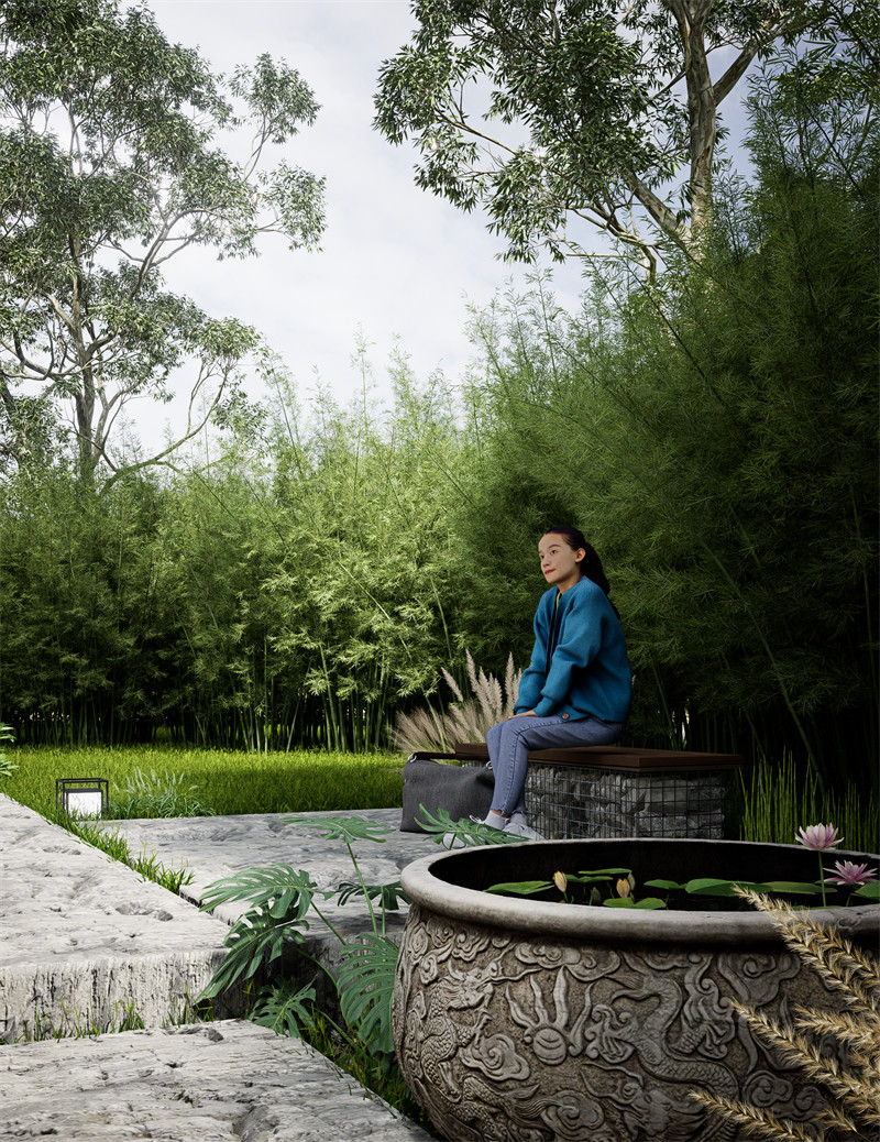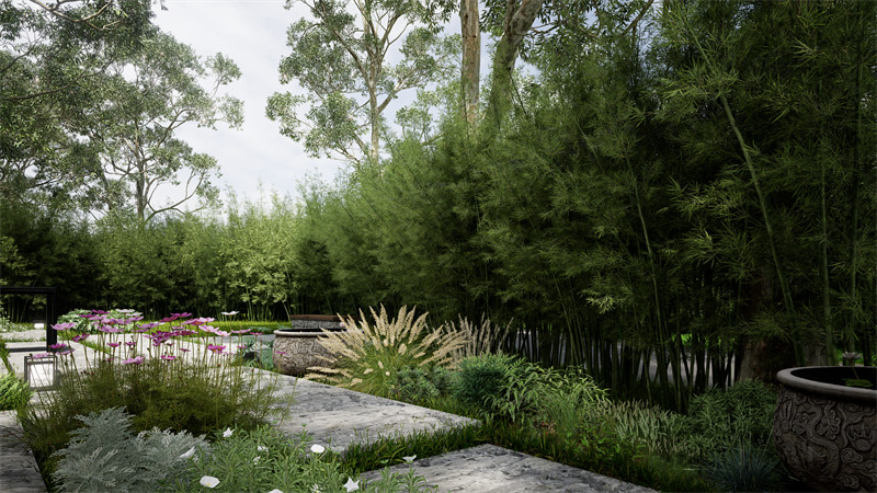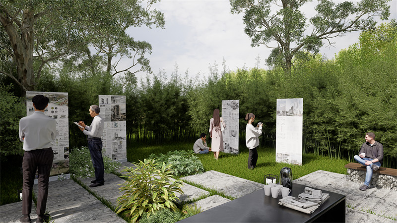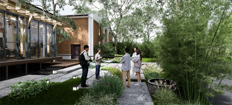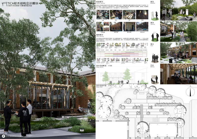 由于底下储水设施高出地表10cm,我们对模块外部的花园进行了一定的填土,并依据土层厚度划分了种植区域。利用条纹花岗岩石板对非种植区域进行线性铺设,既围合出了种植区域,又具有一定的韵律感。场地外围由原有的密集早园竹围合,形成界域划分,还拥有隐喻的视线交错。选用竹木板为主材料,松木为龙骨铺设连接室外地坪与模块的活动平台,让场地水平方向与垂直方向都具有一定的层次。植物种植以观赏性草坪为基础背景,利用多年生与一、二年生的草本植物,打造三季有花、四季常春的观赏效果,同时也为风景园林本科教学提供场地。