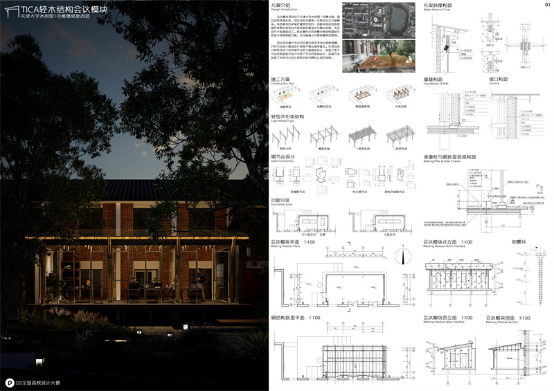 该项目由加拿大木业协会提供技术支持与原料捐赠,并对设计的节点图纸进行了审核与意见指导。项目设计阶段完成了对详细节点的工程做法设计,包括了各个节点在内的构造层次设计与各个节点的连接设计。构建加工和组装依托天津大学新工科通识课平台,在多名本科生的努力下共同完成了部件加工,让同学们学习了各种工具的使用方法并参与木结构建筑的建造过程,更深刻的了解了课本上难以传述的工程问题与解决思路。