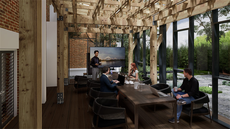 整体结构采用了现代木结构工艺,使用SPF规格材作为结构骨架,并将上下梁架的连接进行了延长,极大地丰富了屋顶的视觉体验。利用隐藏在桁架之间的补光设备,映射在木材上的光影与限制在设定区域的光照便成了场地夜间靓丽的风景。结合1号楼内原有的使用功能(西侧为学生工位与小会议厅,东侧为教师办公室),将原本的窗户改换成了开合门扇,使得两侧区域通过模块进行了连接,方便交流。利用一榀桁架作为分隔,划分出小会议区与会客区。在需要进行大型多人会议时,则可打开分隔移动桌子,整体变为大型会议区。由于场地位于建筑北侧,我们采用了大面玻璃幕墙以及三层夹胶玻璃屋顶的做法,既保证原有建筑室内采光需求,同时使得模块内日间光线充足。