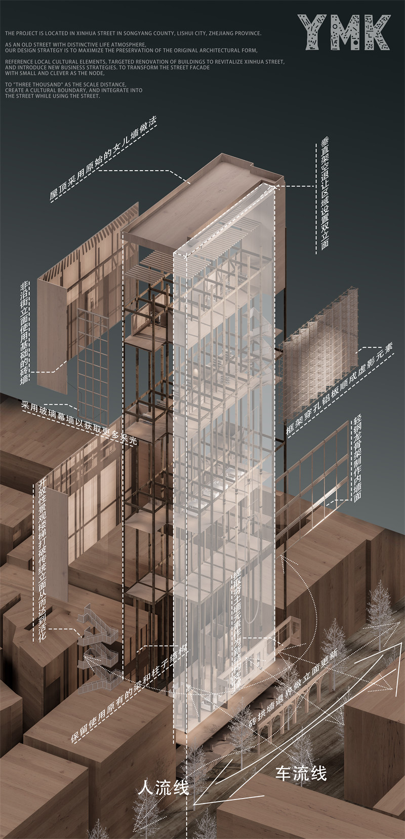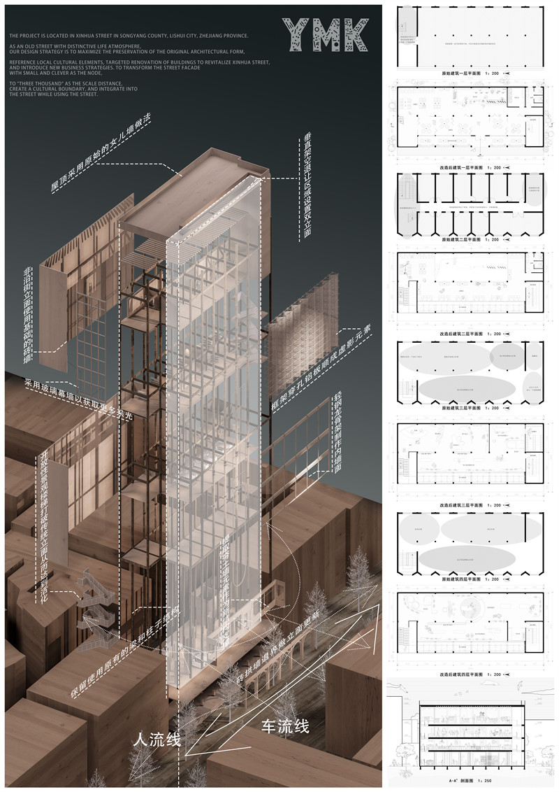 城市微更新是一个时代的任务,当我们发现这个时代逐渐隐去,新的契机也会出现在当时的背景下。我们去调研了松阳县城的新华街道,感受到了老城区的生活气息,也了解了当地的历史文。为了活化街区,我们补救老街道距离的问题,将建筑退让一部分,底层留给开放的公共区域,上方依旧保留属于松阳县城的故事,立面再更新是一个设计策略,我们最大化保留原有建筑结构体系,避免大拆大改,对建筑内部空间重新设计再利用,以小以巧作为节点改造街道立面,以退让的尺度距离作为文化的结界,利用街道的同时也融入与街道里。
