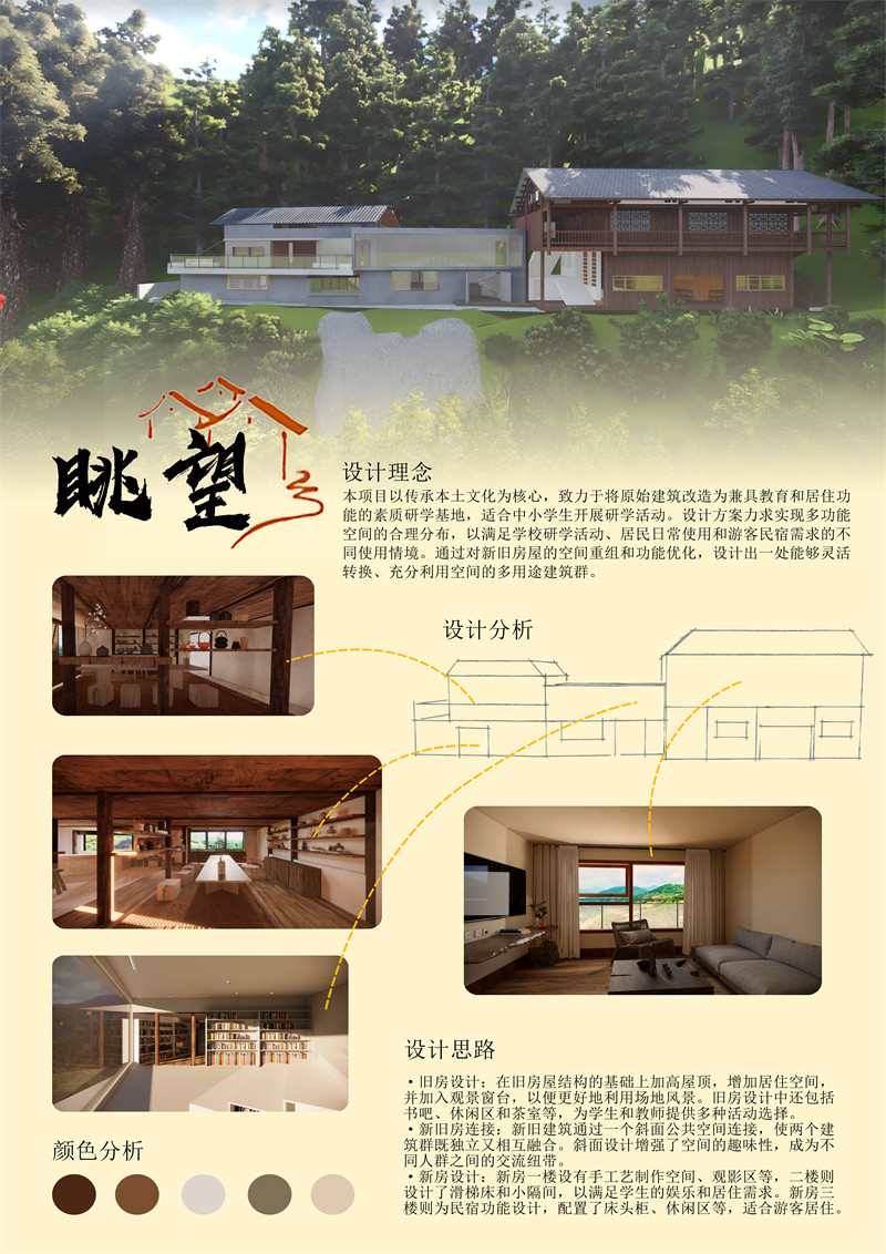 3.设计理念及思路:本项目以传承本土文化为核心,致力于将原始建筑改造为兼具教育和居住功能的素质研学基地,适合中小学生开展研学活动。设计方案力求实现多功能空间的合理分布,以满足学校研学活动、居民日常使用和游客民宿需求的不同使用情境。通过对新旧房屋的空间重组和功能优化,设计出一处能够灵活转换、充分利用空间的多用途建筑群。
