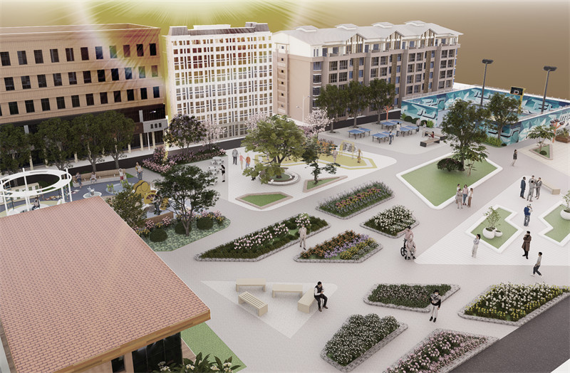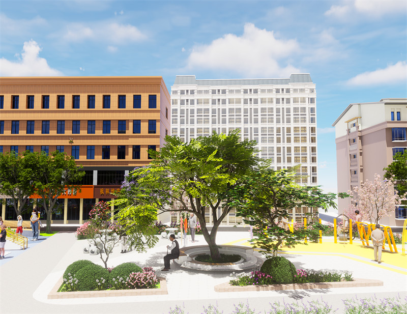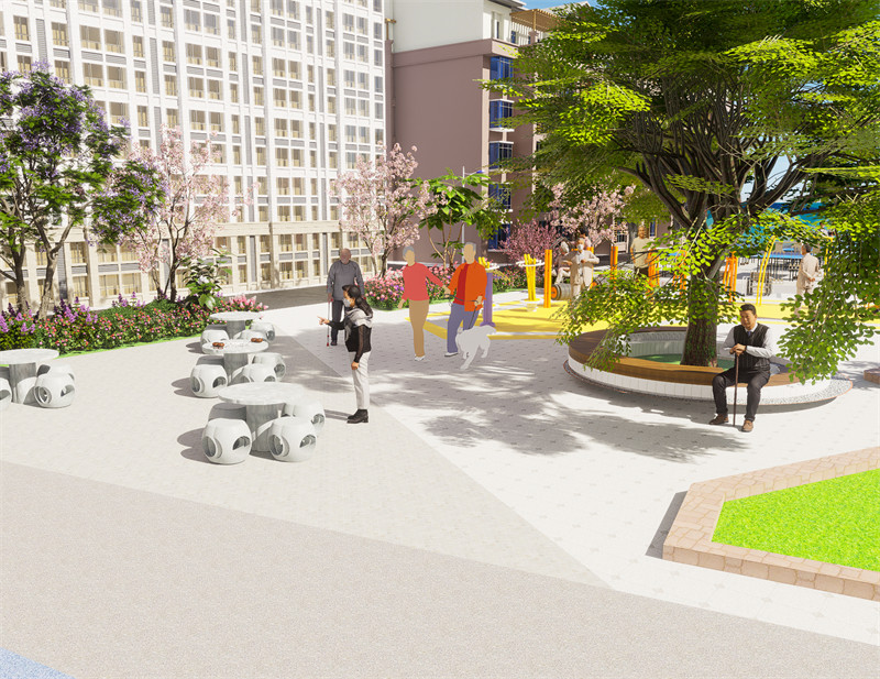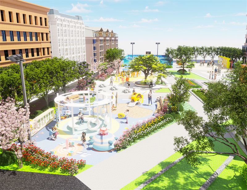 广场还设置儿童游乐设施,大多数老年人可以在广场里遛弯休闲的时候带着孩子去游乐设施玩耍,种植绿色植被能给孩子带来丰富的视觉和触觉体验,有助于激发孩子的探索欲和求知欲。 心理影响:大面积的绿化能营造出宁静、舒适的环境,有助于缓解孩子的紧张情绪,提升他们的幸福感。 将绿化区域与游乐设施有机结合,形成整体协调的布局。