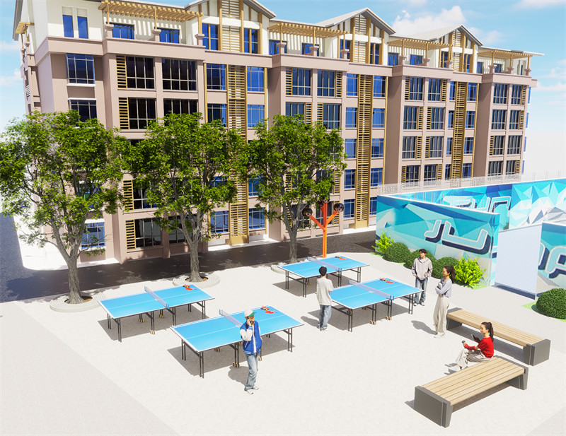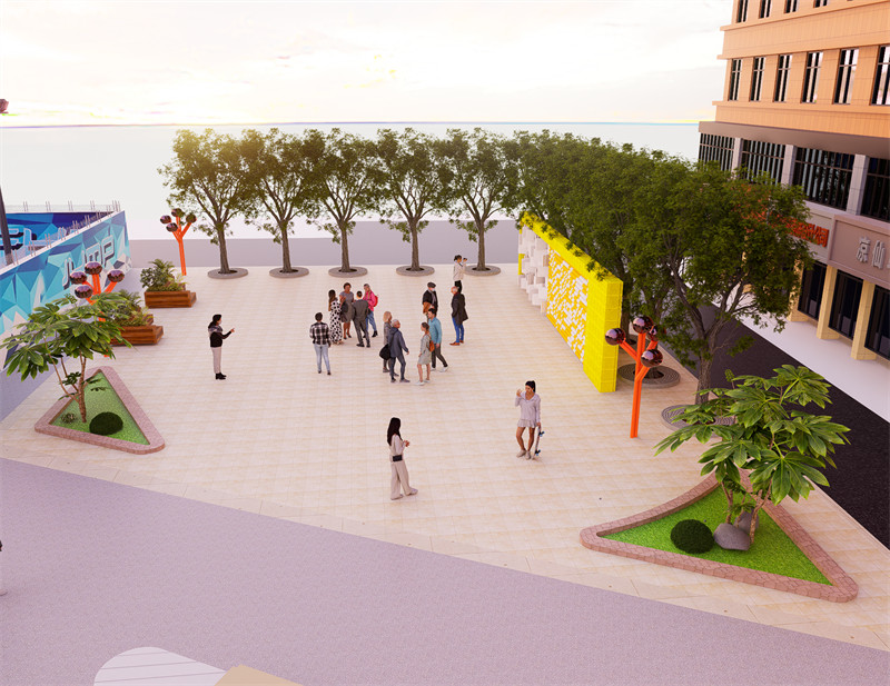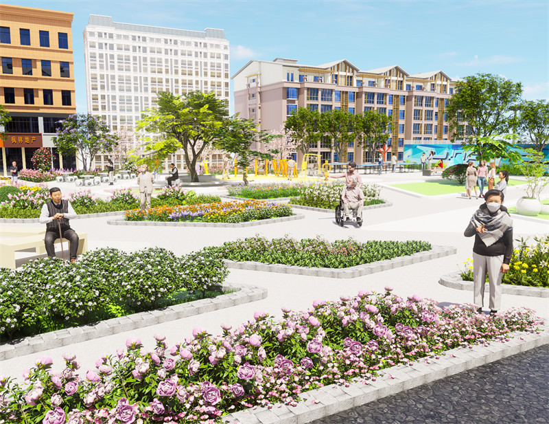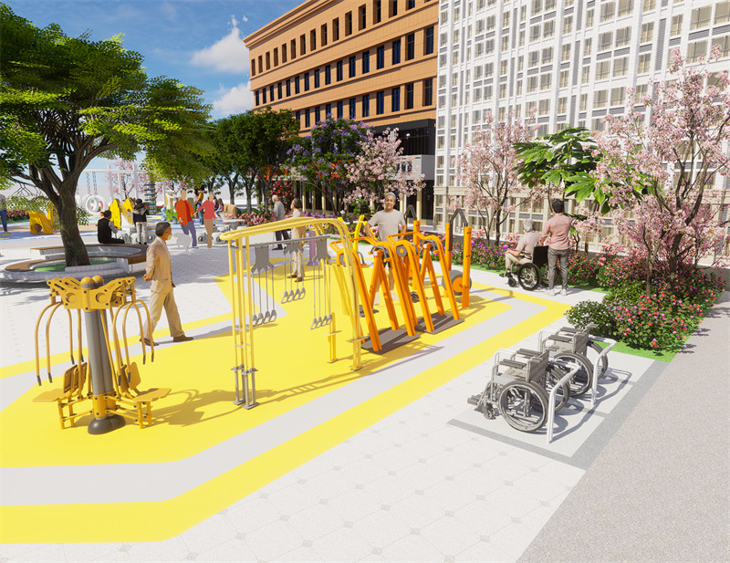 考虑到老年人在行动、交流和认知方面的需求,以设计出符合老年人使用习惯和身体条件的产品和环境。 提供舒适和安全的环境 室外空间要设计便捷的通行道路和舒适的休息场所,同时考虑气候因素和防护措施,保障老年人的安全和健康。广场设有健身花园广场,采用芳香疗愈设计,为配合老年人五觉感官不同程度衰退问题,花园提供了多感官、多层次的信息接收方式,主要造景依托治愈性植物缓解压力、安抚情绪,使得大脑处于一个放松的状态。老人们可以在此聚头聊天,下下棋,跳跳广场舞,感受生活的惬意。广场边还设置了老年人轮椅放置区。此外道路两侧精心设计的驻足和休息点种植了层次丰富的地被景观,可以让老年人沉浸在浪漫的花海之中。健身设施选择暖色系,增强活动的积极性,简单的户外健身器材,促进老年人身体健康。