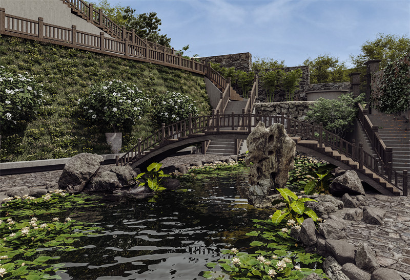 场地内上下层空间连接处为一陡坡,建造观景步道时受力面积较小,遗留安全隐患,增加后续围护成本。解决办法为在陡坡上开辟步道,打造垂直受力面,从而增加观景步道的受力面积,使其更加稳固。