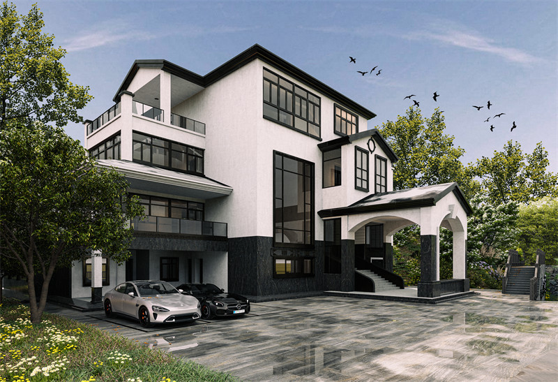 在不改变原框架结构的基础上,通过对色彩、材质、雕饰的搭配,以达到建筑与景观的和谐统一。在材料选择上,使用中国传统材质青砖、灰瓦、木材;在配色上,采用米色和青灰为主色调,以削弱建筑外观的欧式感;在细节上,加入中式纹饰,增添中式氛围感;在栏杆和围墙的装饰上,适当镂空设计,平衡建筑的体量与景观的轻盈;此外,加入现代化的建筑材料,如玻璃、钢材等,以达到更好的结构和功能。