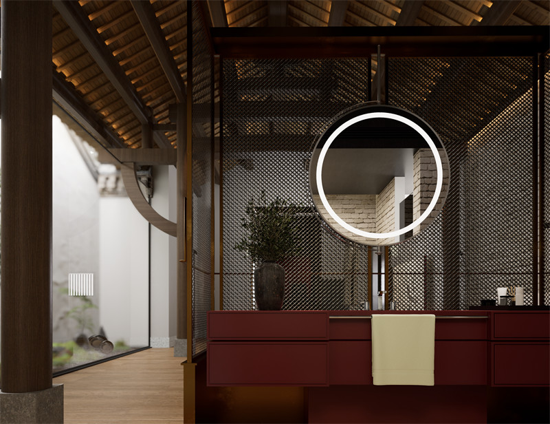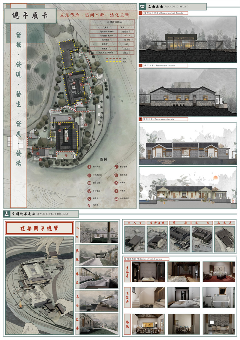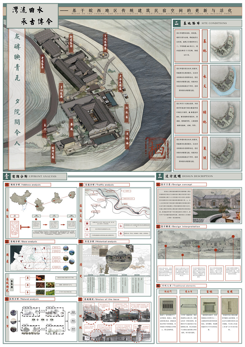 本项目背山面水,地势后高前低,地形有缓缓起伏而无陡坡峭壁,鸟览视角地形湾流如丝地形如月山丘似玉,无不彰显自然之鬼斧神工。项目中主要水体与主体建筑交相呼应且相对而座,给游客以极佳的观光位置和居住体验,风水中对于此种布局更称之为玉带之水。针对原有建筑考察其历史价值,将皖西北传统建筑与现代设计手法有机结合,将粗犷热烈的传统韵味与规整统一的现代文明贯通融合互生新辉。项目主要动线规划遵循围绕中心,以自然为屏的原则,在基于中式建筑的四平八稳之上给人以曲径探幽的游览感受。自然与建筑交相融合,建筑以自然为衣,自然以建筑为体,给游客以走入自然融入自然的切身体验。