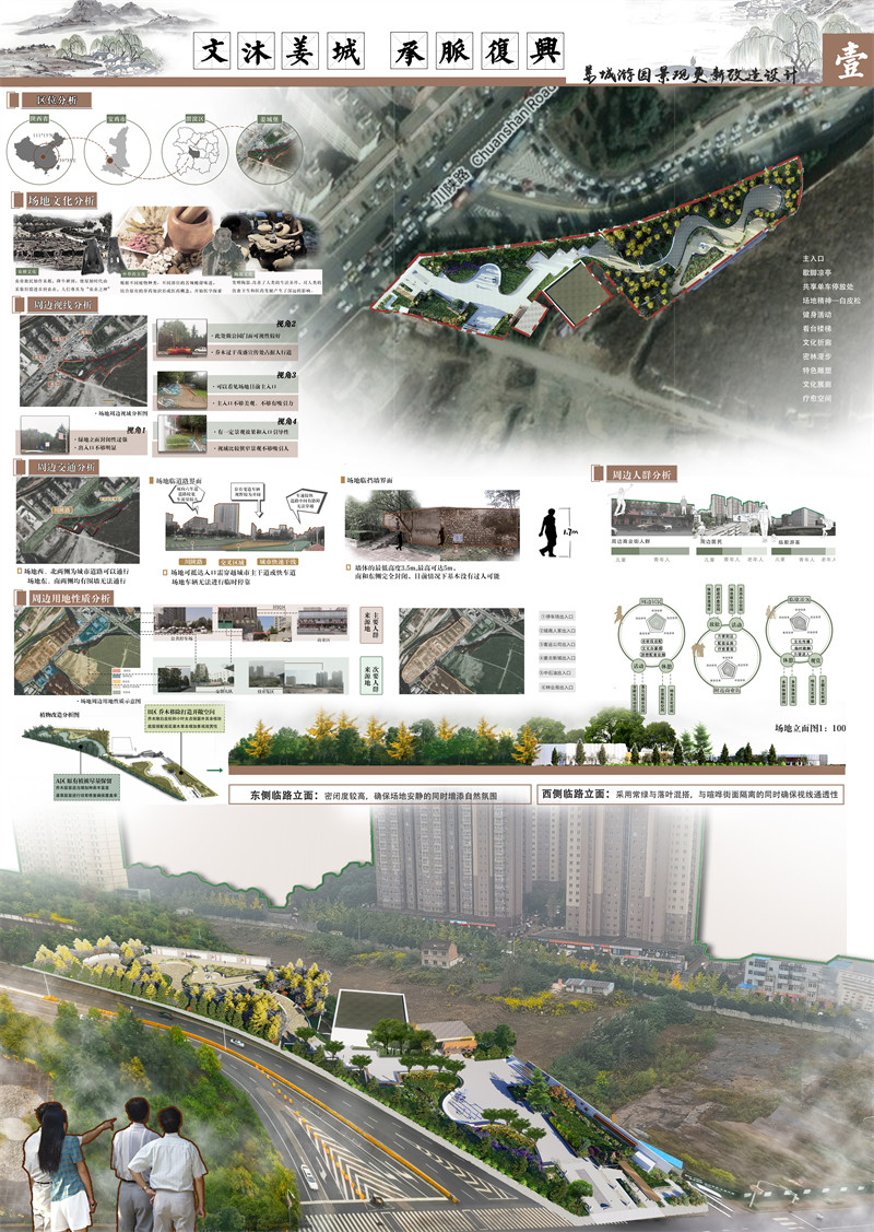 ③社会层面:设计传递社会和文化的深刻内涵。将宝鸡特色文化元素融入休闲娱乐,具有良好宝鸡文化展示功能,提升门户形象,为周边市民提供良好的休憩空间的同时,也给给来往游人留下美好印象。
