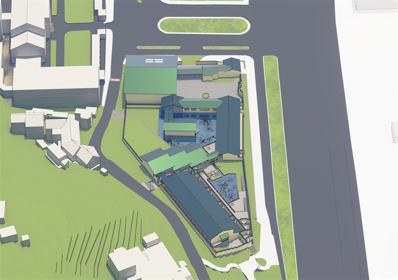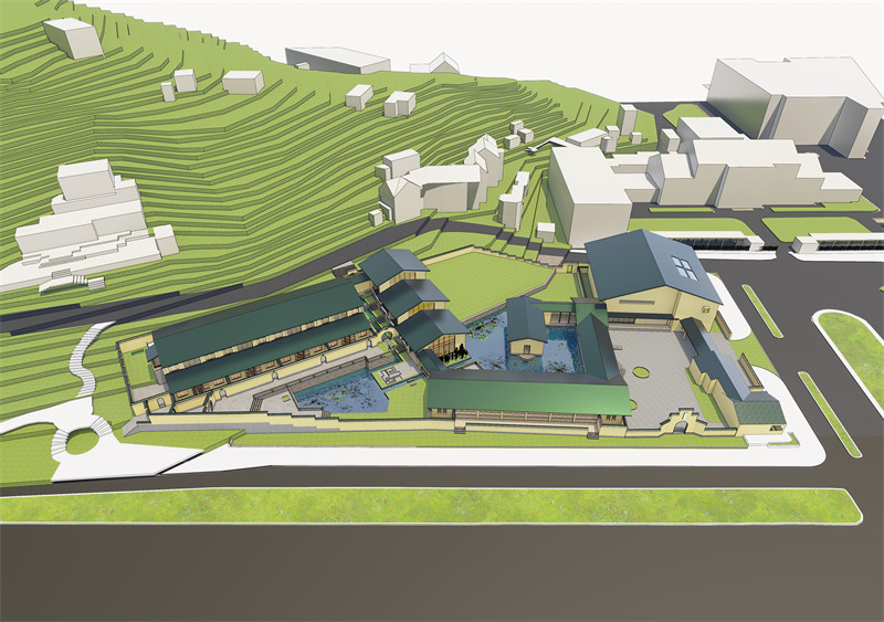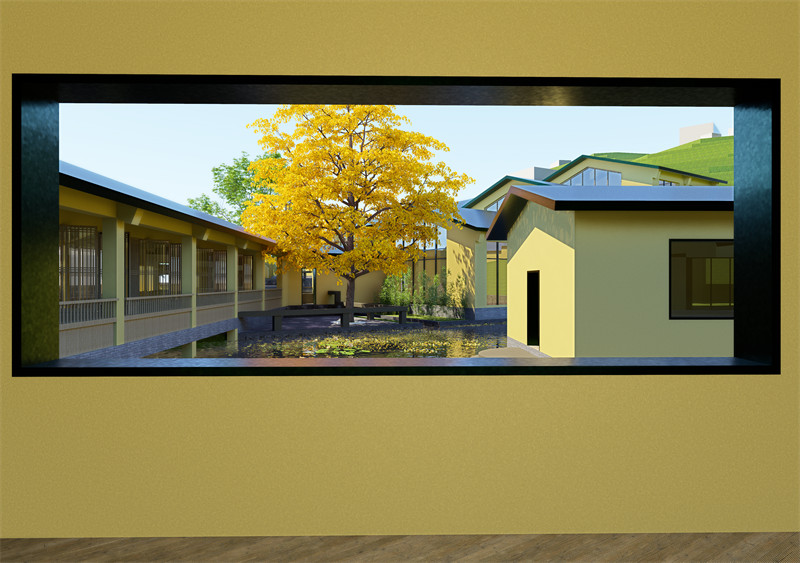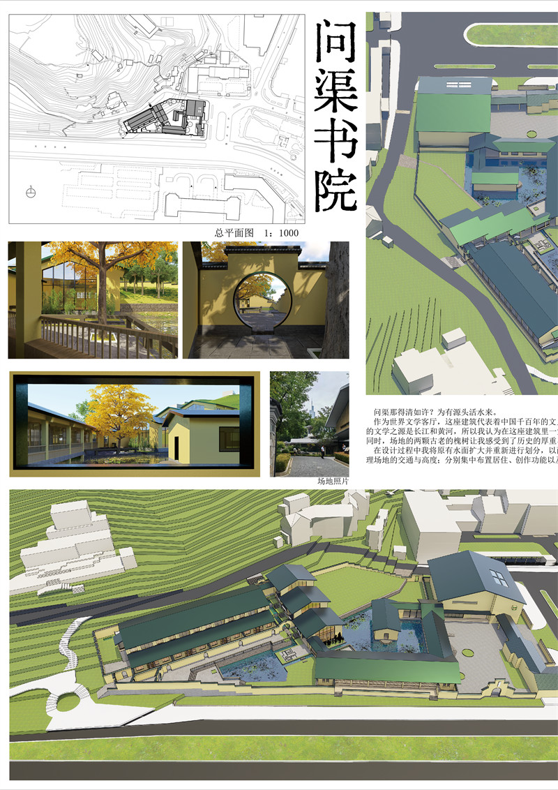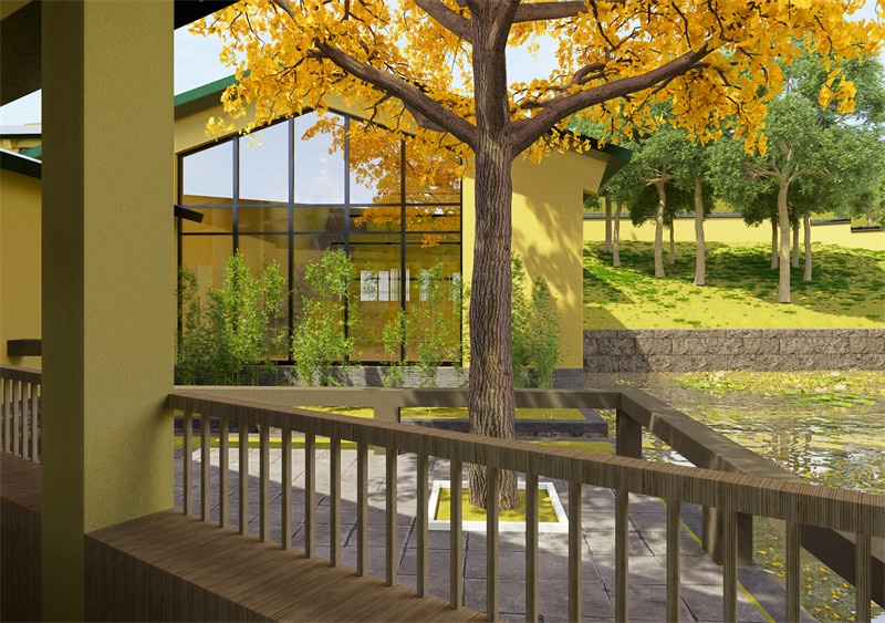 问渠那得清如许?为有源头活水来。作为世界文学客厅,这座建筑需要代表中国千百年无数文人的形象。有学者认为中国的文学之源是长江和黄河,但场地内只有一汪小小的水塘,完全没有品质,所以我认为一定要在这里营造有良好的水景,兼有流水、静水、淌水并赋予其文化意义。与此同时,场地的两颗古老的槐树让我感受到了历史的厚重与传承,他们枝枝相覆盖,叶叶相交通,构成了兼具仪式感与自然的一道大门,所以我要将他作为入口的一部分。在设计过程中我引入雨水和山泉水,将原有水面扩大并重新进行划分为东西两面,以两个古树为新的入口,重新整理场地的交通与标高;分别集中布置居住、创作功能以及阅读、餐饮、休闲功能,按照隐私性质分在东西两侧。在设计过程中灵活采用中国古典园林意象、中国乡土建筑语言和现代建筑结构与尺度设计策略营造城市园林,在物质与精神空间上与城市和文脉发生深度联系。在色彩上运用与既有建筑相同的黄绿配色,黄色是对鸡鸣寺和南京众多民国建筑的回应,绿色如雨花石一般温润。这样的配色与张道一先生设计的东南大学校标有异曲同工之妙。在树种的选取上保留了场地原有的槐树、棕榈树与银杏树,对各类树木的数量有所调整。