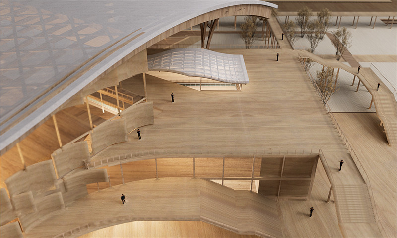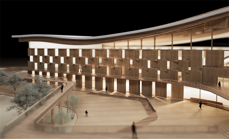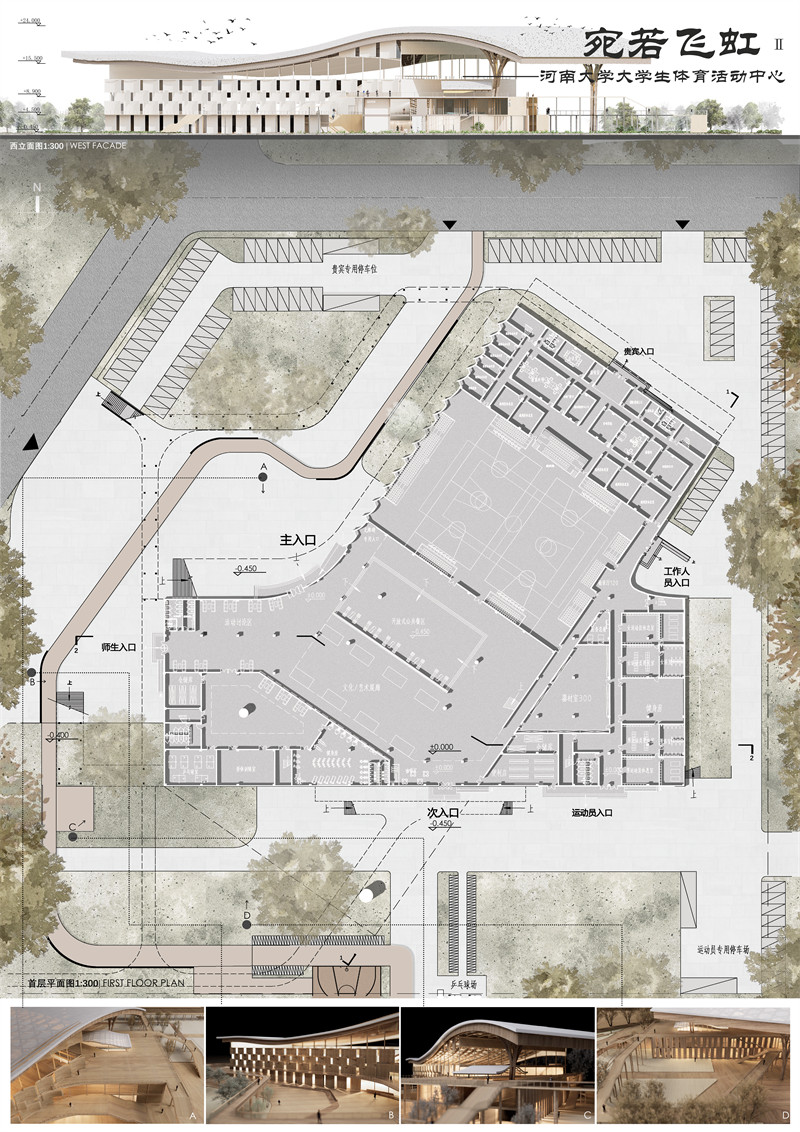 造型与象征意义:在造型方面,体育活动中心的整体设计将呼应“虹桥”的形态,宛如飞虹般的曲线寓意河南大学不断生长的动态发展。这一形态设计旨在传达灵动与创新的理念,同时与周围景观产生和谐的共鸣。通过这种设计,建筑不仅仅是一个单独的功能空间,更是一个具有文化内涵的象征体,以展现出学校开放型、流动型和人文型的校园环境。