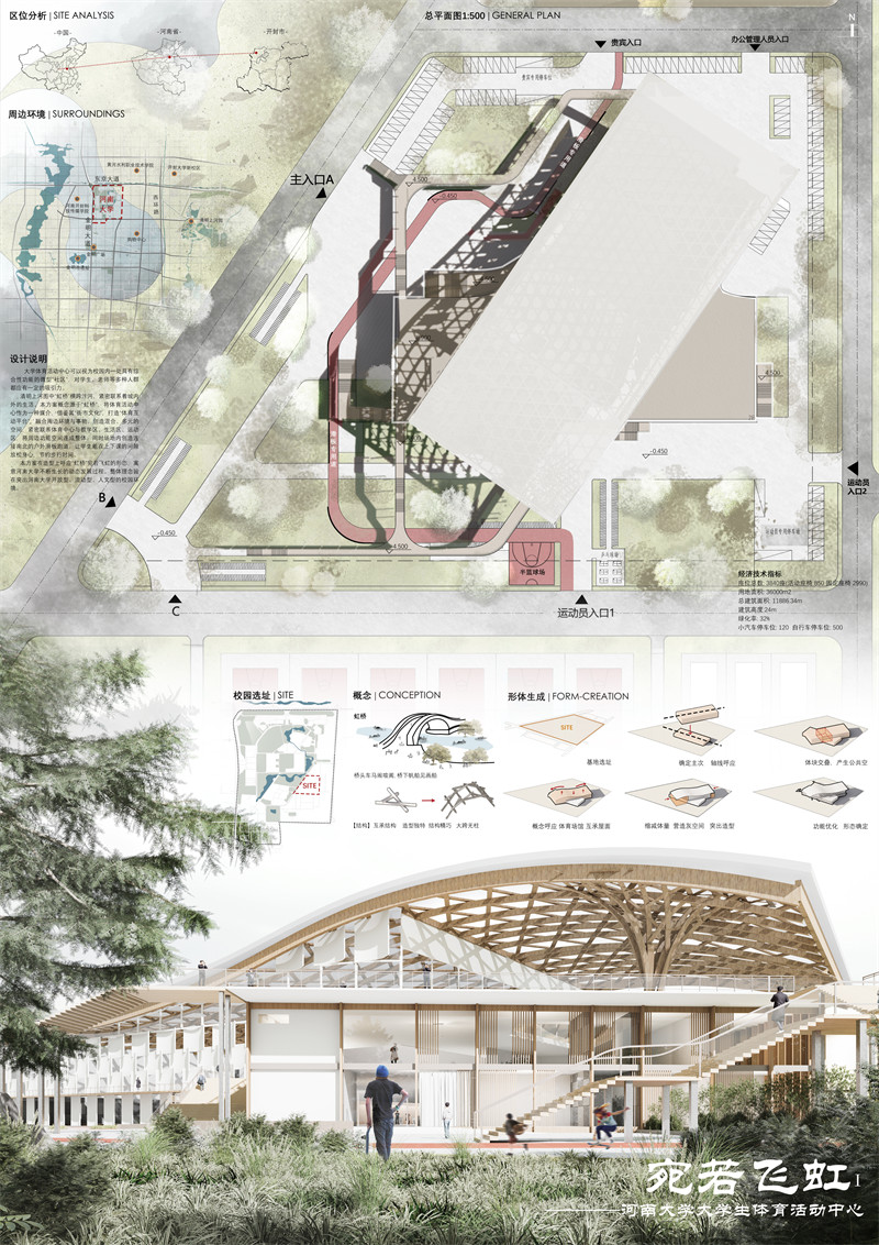 大学体育活动中心作为校园内一处具有综合性功能的微型“社区”,在促进学生、教师与其他人群之间的交流与互动方面扮演着重要角色。其设计不仅要满足体育活动的基本需求,更要考虑到如何吸引多种人群参与,营造一个和谐、活跃的校园氛围。本设计方案位于中国河南省开封市河南大学内,希望打造出一个融合多元文化及功能的综合性体育活动空间。