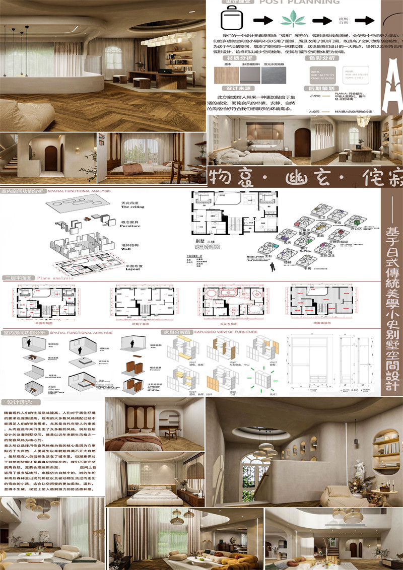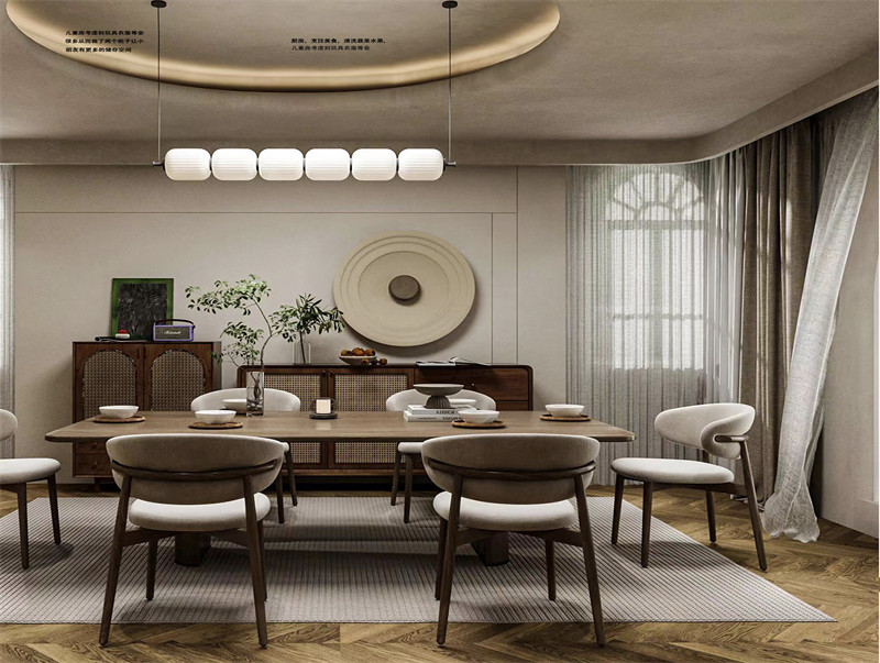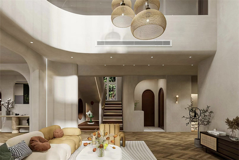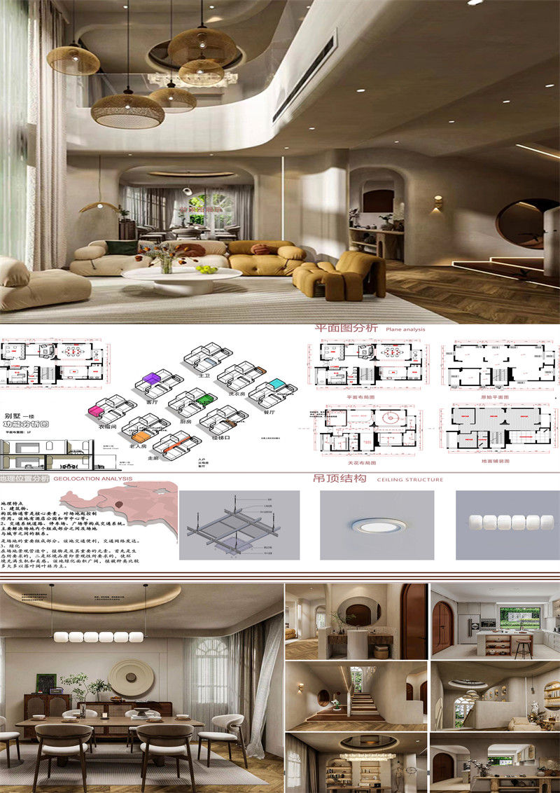 色彩搭配上,以自然、柔和的色调为主,如米白色、木色、灰色等。这些色彩不仅能够营造出温馨、舒适的居住氛围,还能够与天然材料相得益彰,强化设计理念中的“宅源”概念。