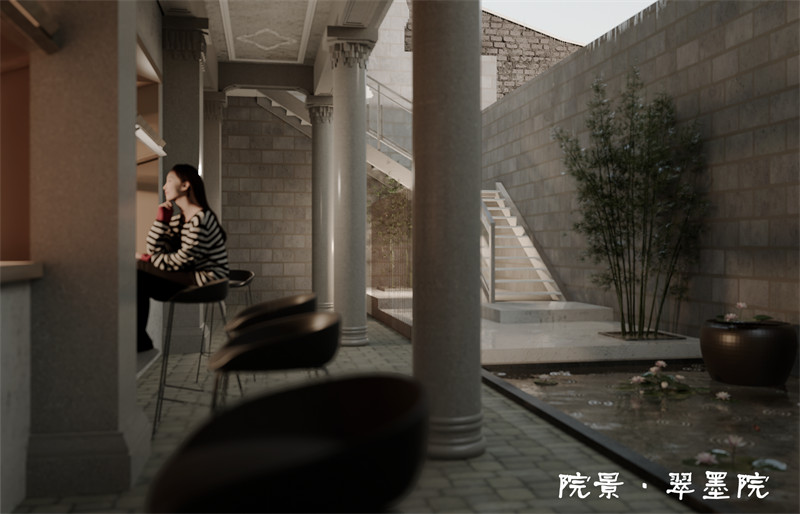 3.设计理念及思路:历史建筑的更新需要契合当地的历史文化,通过前期调研我们提取了场地内大小三十六坊的重要元素,而其中墨池坊最具盛名。传说“王右军临池作书,洗砚于此,故得名”。基于这一基础,我们以当地“墨”文化为切入点进行设计,旨在打造能与游客互动的文化叙述性建筑。当地的居民是烟,游客是胶,他们在这里融合碰撞共同组成了一个墨块。建筑像一个砚台,承载着这场新旧交织的盛大活动。当人们在建筑内进行活动时,也意味着一次次细密的研磨,最终研磨出鲜活的墨水,也意味着承载厚重历史的老房子激发出新的活力。
