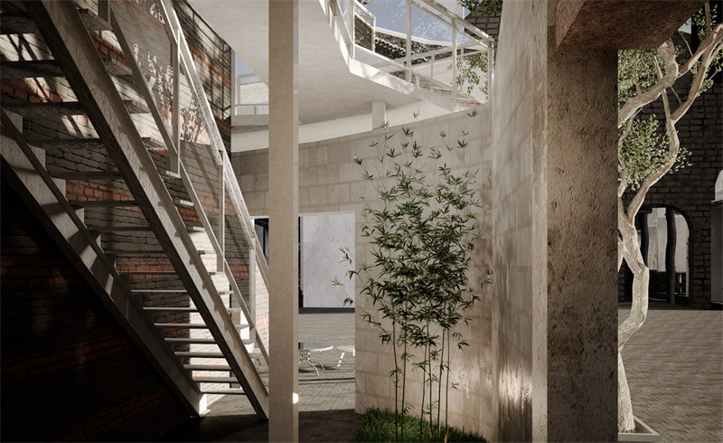 为最大限度恢复民国时期居民建筑遗产并凸显其与新增建筑强有力的视觉冲击,我们采取“最小干预”的策略,分别对前院、矮房、院墙、展陈、露台、立面进行改造。保留建筑原有结构,置入玻璃体及围廊交通体系,串联整个建筑空间,提供多个历史文化体验和展览空间,为整个场地注入全新活力。