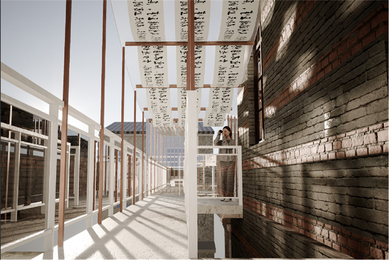 7.材料的选取:我们使用白色钢结构建造廊道,与历史的红砖墙进行咬合碰撞。同时在建筑立面使用黑色与白色的对比色,也用以体现“墨”的主题。打破建筑原有的石墙,通过开辟开放的空间,以此表达对居民的欢迎。