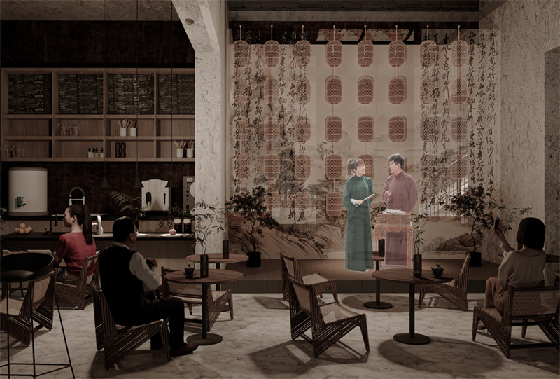 为了营造浓厚的文化氛围,吸引更多人关注和参与墨文化与书法艺术的学习和传播。我们在建筑中设立听书空间。听众聆听说书人关于墨水故事与其文化的讲解。最终形成一个有深度、有温度的文化参与空间。