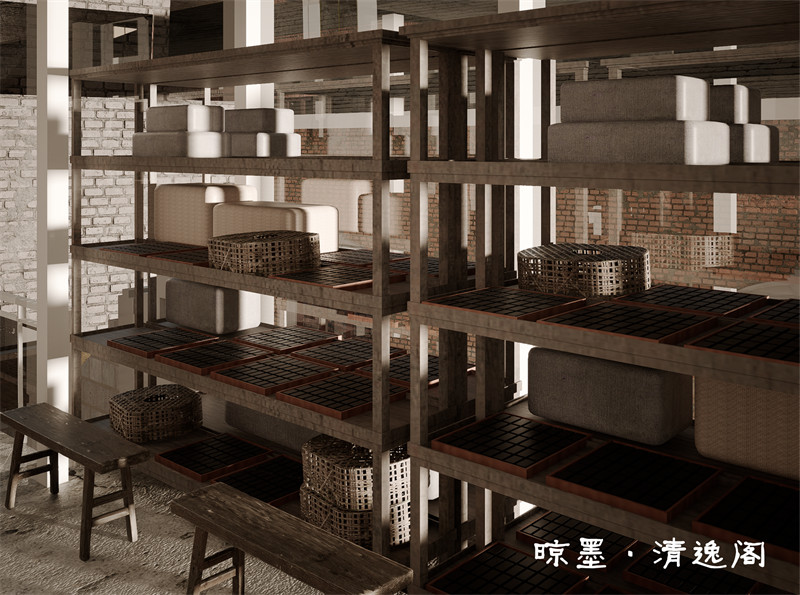 为了增加游客的体验与互动,我们在二层的半室外玻璃体内设置了磨墨晾墨区域,这是一个相对独立且通风良好的地方。可以确保墨水的自然晾干,同时不会干扰到饮茶的氛围。