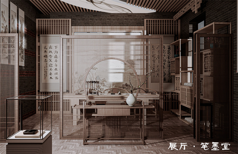 6.具体节点设计:古人采墨主要是从天然矿物获取。在墨中加入胶后,还加入中草药,最终墨香四溢。我们模拟古人采墨的场景,在入口处设置小型水池和植物,代表自然中的墨源。同时选择竹子、荷花这种具有文化寓意的植物,营造出一种自然、古朴的氛围,能够增强空间的文化氛围和艺术感。