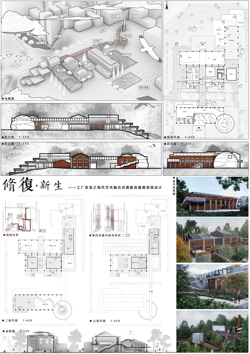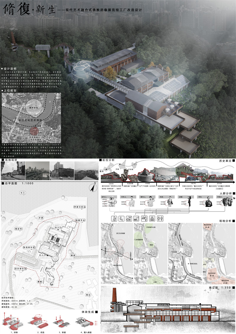 7.设计说明:本设计选址于重庆巴南,是水轮机厂的改造设计。该位置临近江边和李家沱码头,是原工厂的“中转站”,我们将改造分为全保留,部分保留。新建三个板块,对原有建筑进行修复更新。同时响应政府打造长江两岸艺术圈的号召,利用其独特优越的地理位置,打造现代艺术融合式的佛教造像展览馆。顺应当代年轻人思想潮流的同时,也立志成为城市轴线上的独特打卡地标。