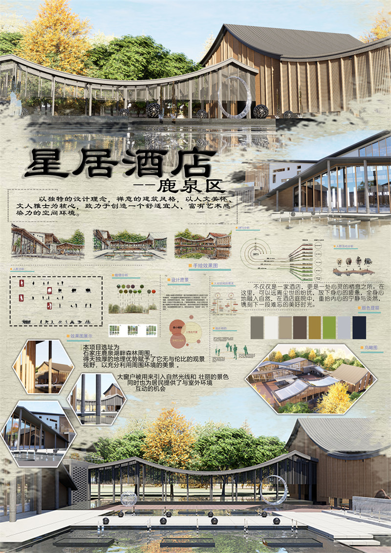 本项目选址为石家庄鹿泉湖畔森林周围。得天独厚的地理优势赋予了它无与伦比的观景视野,以充分利用周围环境的美景。大窗户被用来引入自然光线和壮丽的景色,同时也为居民提供了与室外环境互动的机会。设有宽敞的露台或甲板,供人们在温暖的季节里欣赏周围的美景和放松身心。景色优美,历史氛围浓厚。感受到木材的天然质感和温暖,每一根木梁和木板都散发着自然的香气。介旅游文化的影响,交通便捷,将此处的传统居民住宅改造成民宿能带来可观的经济效益,这对振兴乡村有着很大的意义。