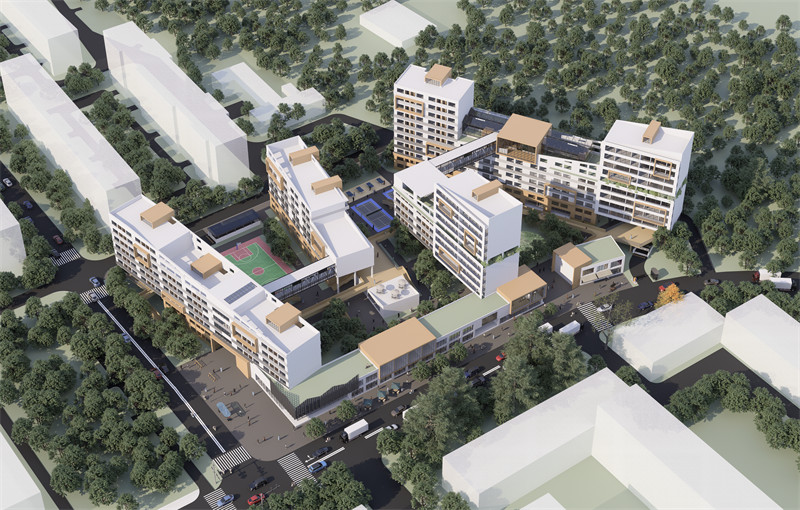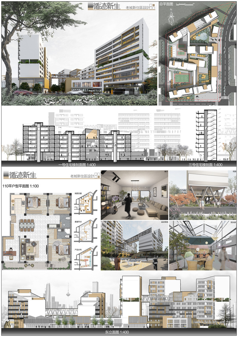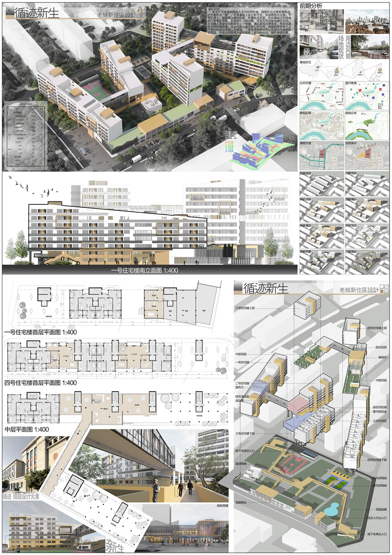 本设计思考场地周边人文与自然环境,通过现场调研,感受周边建筑氛围与空间体验,希望创造出有原有空间肌理的住区,并提升该场地的文化氛围与空间丰富度,由此生成“循迹”的理念,即循场地周边肌理与文化。本设计的做法是设计板式多层住宅,呼应原有场地肌理,并通过调整建筑朝向以优化住宅日照时数,并且为宅间场地退让空间提升居住品质;另一做法是提取东北大学老建筑设计元素作为“底”,在其基础上设计新住宅,形成两段式立面。新建筑仿佛从老建筑中生长出来,寓意为“新生”。