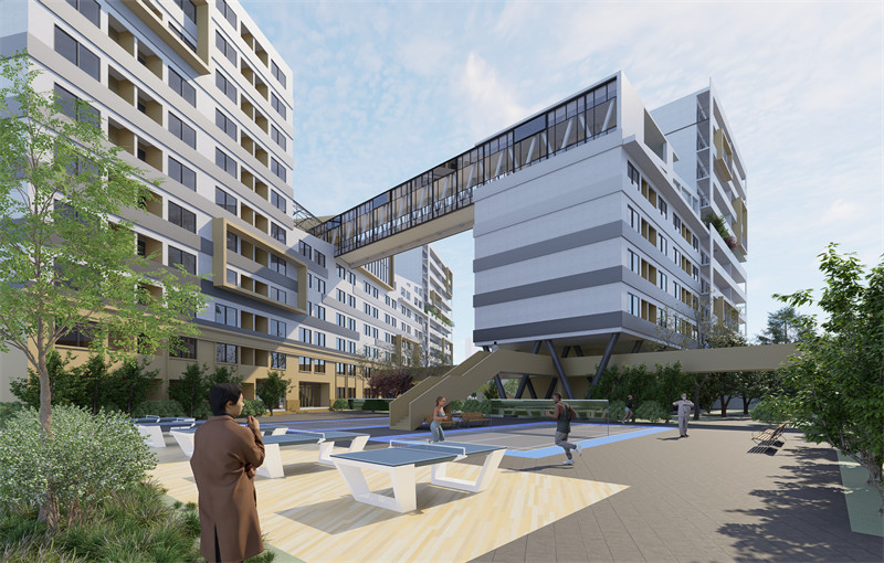 场地布置上,在东侧人流量较大的道路设计商铺,满足居民日常需求,并且给居住空间形成屏障。场地内部设置多层公共空间,第一层是地面层,从南入口到北入口之间形成人行主轴,并连接不同宅间绿地空间与室内公共空间,形成多个丰富的空间节点。地面层作为主要入户路线,运动场与绿地的设置满足了居民日常的休闲需求,丰富的绿化空间也为居民提供了较好的入户景观。第二层为高架廊道,此廊道区别于地面层的是流线更加流畅,并充分利用立体空间为住区提供更多的公共活动空间,二层廊道连接了三个主要的空间节点,南北两个节点为楼底花园,中间为住区内部的室内公共服务空间,廊道在各处都设置了步梯连接地面层,让其与地面层连接更加紧密,并共同发挥出更大的效益。第三层的公共空间为中层花园区,由于产品分布的不同,中层花园主要服务于品质相对更高的大户型住户,而第一层和第二层的公共空间是为全体住区居民服务。中层花园位于住宅楼中部含有咖啡厅,阳光房休闲区,花园区等功能区,并且具有良好的景观视线,能够俯瞰北侧南湖公园的自然景观。