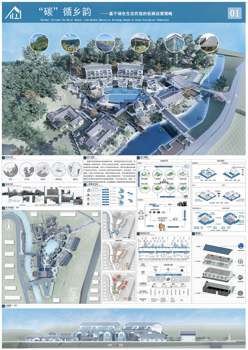 “碳”循乡韵——基于绿色生态民宿的低碳运营策略的设计,旨在融合环保、可持续性和地方文化元素,为游客提供一种回归自然、亲近大自然的生活体验。建设民宿居住群,发展旅游业,恢复乡村活力,保护生态环境。这种设计理念强调对地域自然生态的尊重,追求人与自然的和谐共处,同时也注重传承和展示当地的文化特色。并且采用了多种环保材料和技术,以减少对环境的污染,使用太阳能热水系统、雨水收集系统等可再生能源技术,降低能源消耗。通过合理规划空间、个性化装饰和设施配置以及使用环保材料和节能设备等措施,可以打造出舒适、温馨、环保且具有地方特色的民宿环境,为游客提供一种独特而舒适的住宿体验。