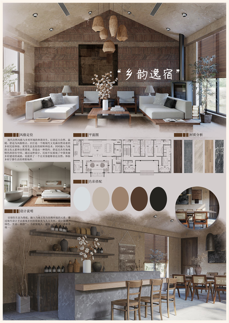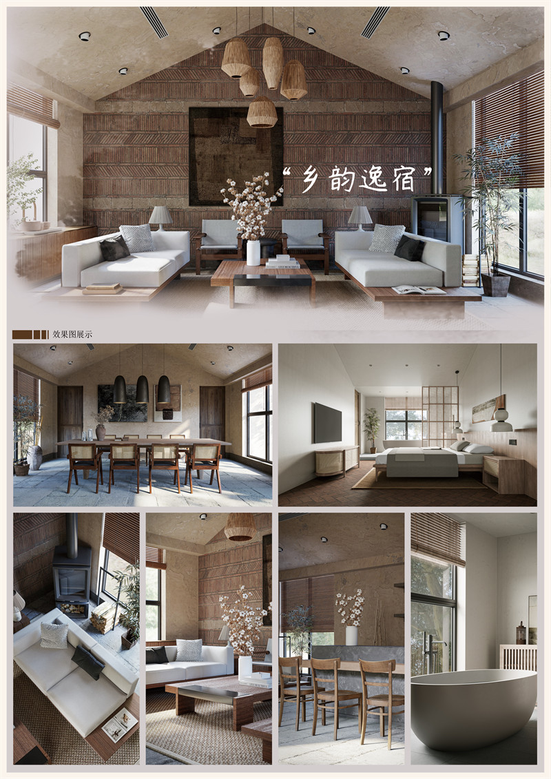该作品采用现代自然风格与乡村环境的和谐共生,以亲近大自然、温暖、舒适为风格特点。在打造一个既现代又充满自然诗意的乡村民宿体验。采用生态友好的材料和技术,同时融入当地的文化元素和自然景观,营造出一种简约、舒适且具有地域特色的居住空间。通过这种设计,民宿不仅展现了中国美丽乡村建设的成就,也提供了一个让宾客能够亲近自然、体验乡村宁静生活的理想场所。