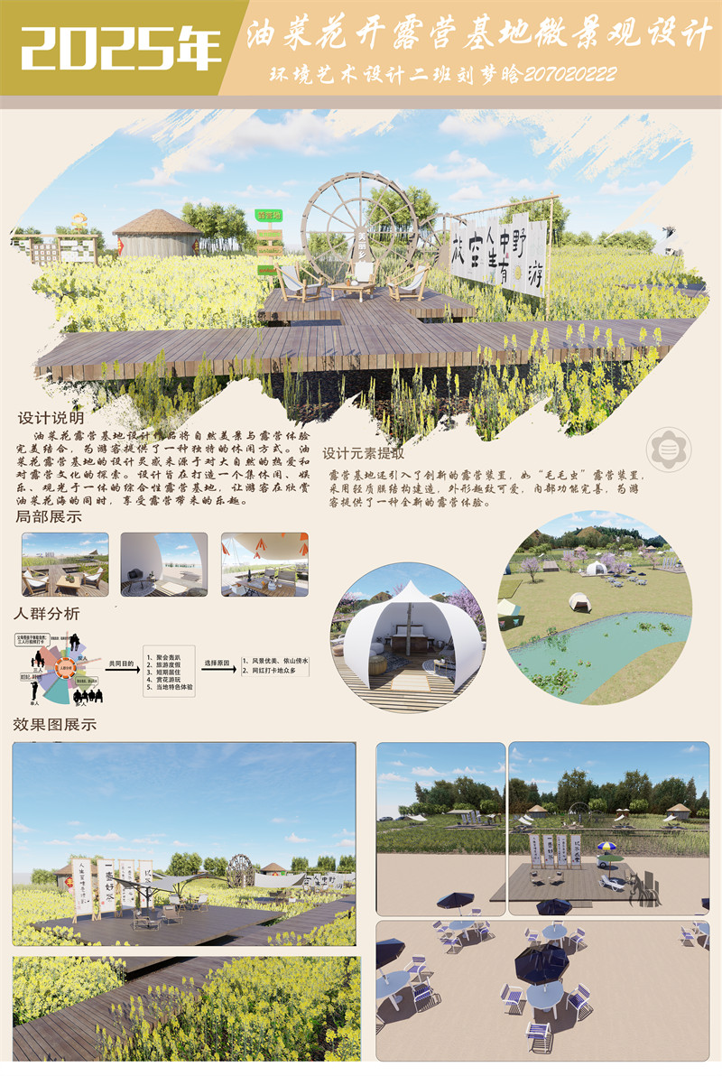 油菜花露营基地设计作品有效整改河边空地,不浪费资源绿地,以其独特的设计理念、完善的功能区域、创新的设计元素和丰富的设计亮点,打造便民利民的露营基地,无论是想要远离都市喧嚣、亲近自然,还是想要体验独特的文化风情和美食,无论是欣赏油菜花海的美景,还是感受当地的文化氛围,或是享受互动带来的乐趣,油菜花露营基地都能满足游客的不同需求。