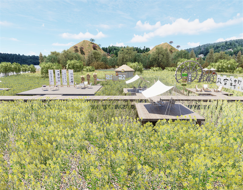 油菜花露营基地设计作品将自然美景与露营体验完美结合。将原有的河边地块进行微更,采用生态友好的设计手法,提高场地的生态功能。为游客提供了一种独特的休闲方式。油菜花露营基地的设计灵感来源于江西婺源篁岭。尊重自然生态环境,尽可能的利用之前的地形地貌生态。将原有的河边地块进行微更新,发挥之前的河边生态优势。新设计旨在打造一个集休闲、娱乐、观光于一体的综合性露营基地,让游客在欣赏油菜花海的同时,享受露营带来的乐趣。