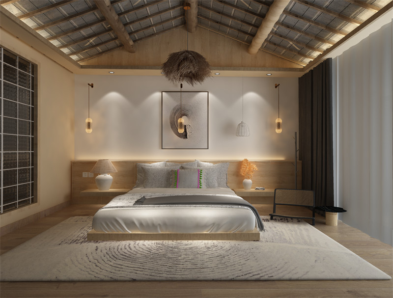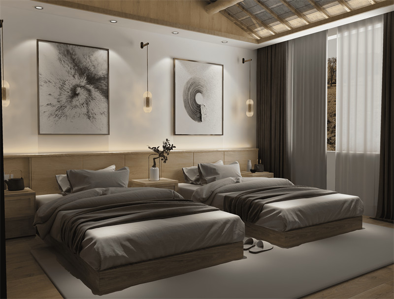 另外,色彩的渲染与规划在中式美学中也占据着重要地位。民宿的主色调应以柔和、自然的颜色为主,如米黄、青绿、咖啡等颜色,以营造出宁静、舒适的氛围。可以在墙面上选择一些具有中国文化元素的壁画或书法字画,以增强中式美学的氛围。这些色彩与装饰元素相结合,不仅给民宿增添了生气与活力,也传递了中国文化的独特韵味。