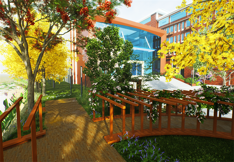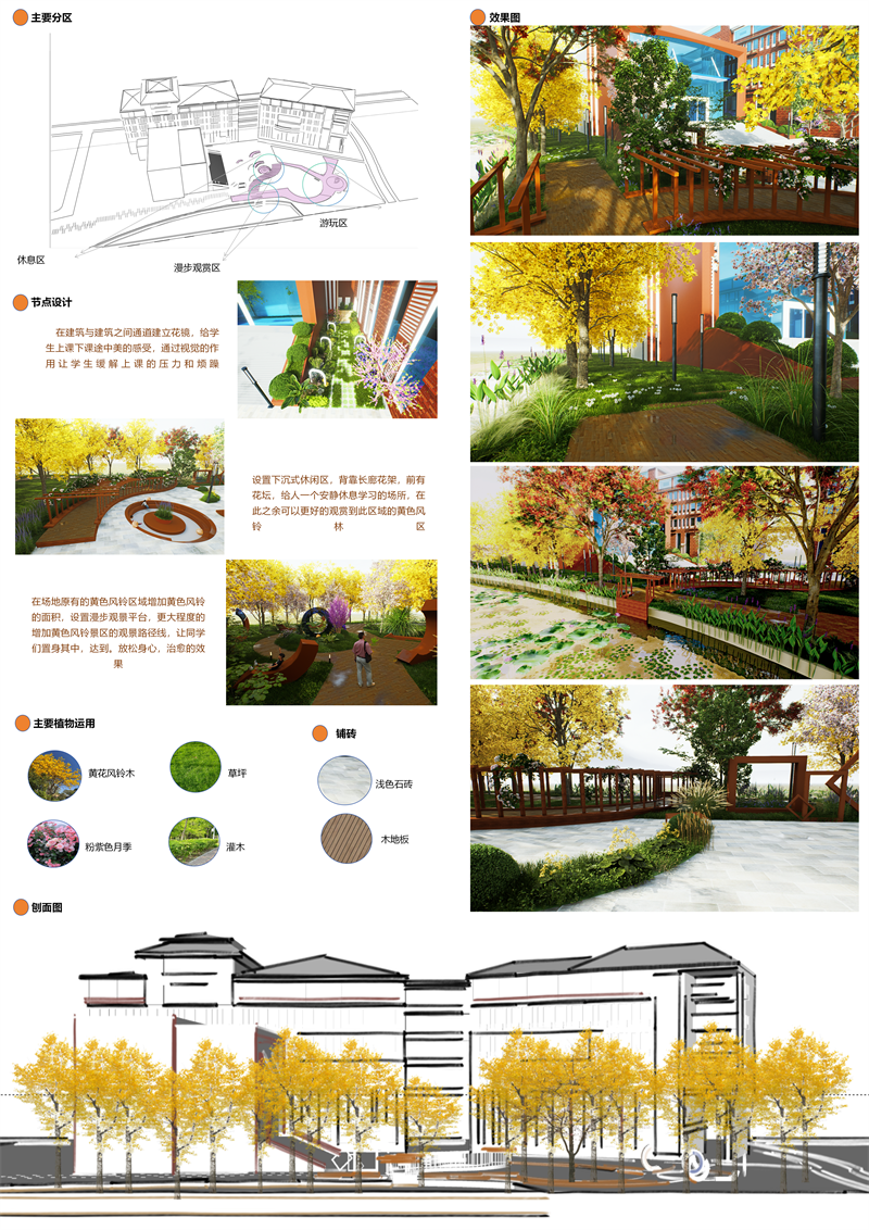 设计原则:疗愈花园的设计注重健康疗愈、绿色生态和人性化需求,通过景观设计营造舒适、安全、放松的环境,帮助学生缓解压力、恢复精力。
