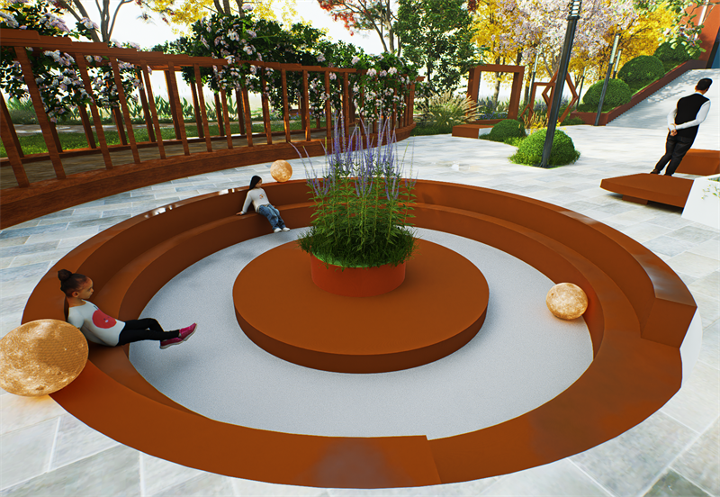 以花架及圆花坛为中心点,向四周扩散,打破原来的单一空间,建立多个次要节点。