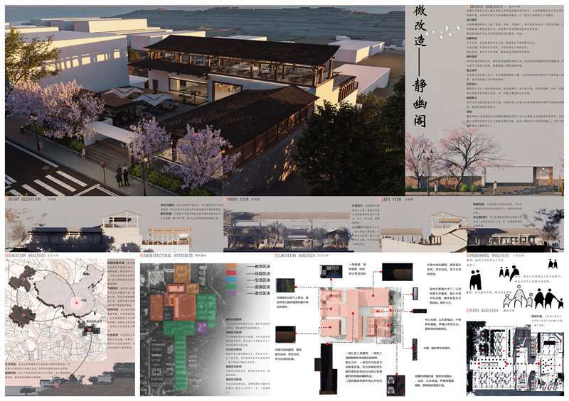 设计思路:重庆邮电大学坐落于重庆市南岸区南山,周围拥有数个古建筑风景区。古建筑元素丰富且广布。我个人认为该区域的建筑微改造应与之遥相呼应。因此确定以木结构建筑为改造方向。经过多次调研以及修改并随着产出静幽阁。