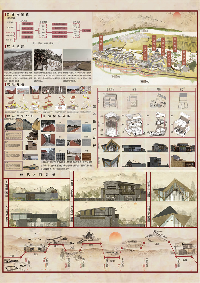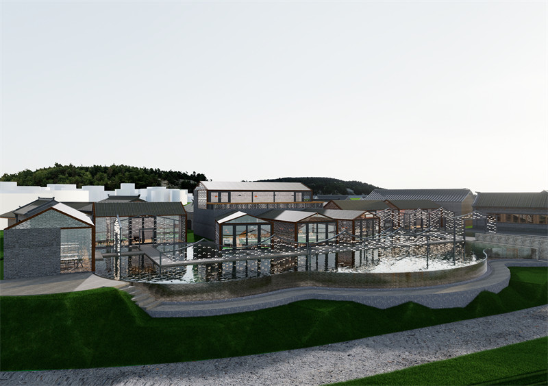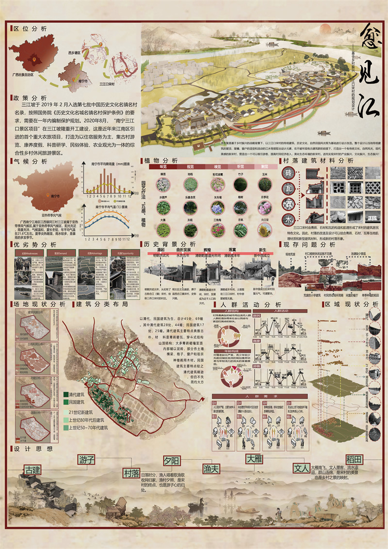 三江口宋村处于左江和右江的交汇处,两江交汇便形成了南宁的母亲河——邕江,因此我们将地址选在了这个三江交汇之处,希望能通过这个作品,让更多人了解到宋村,了解到南宁甚至我们广西的传统文化。而本作品是基于乡村振兴的战略背景下,而乡村振兴,在我们看来,并不是简简单单的美化乡村,而是要深度发掘乡村的传统文化,自然风光,产业情况,激活乡村的活力,吸引各方游客,为村民增加收入,为外出的游子提供一个心灵的栖身之所。因此我们以三江口宋村的传统建筑,历史文化,自然田园风光等为基础进行设计改造。整个设计以当地传统建筑的屋顶,屋檐,窗户的造型和流动的江水等提取出设计元素,在不破坏现有古建筑群的前提下,打造出一个有传统文化,自然风光,现代美感的新宋村,营造出一个可以吸引游客,提高村民经济收入,美化生态环境的新宋村。进而实现宋村的产业振兴,文化振兴,生态振兴!我们的设计思路一直都是以“传承和发展”“传统与现代”为指引,既保护当地的传统古建筑,又将一些现代建筑融入其中。