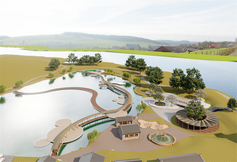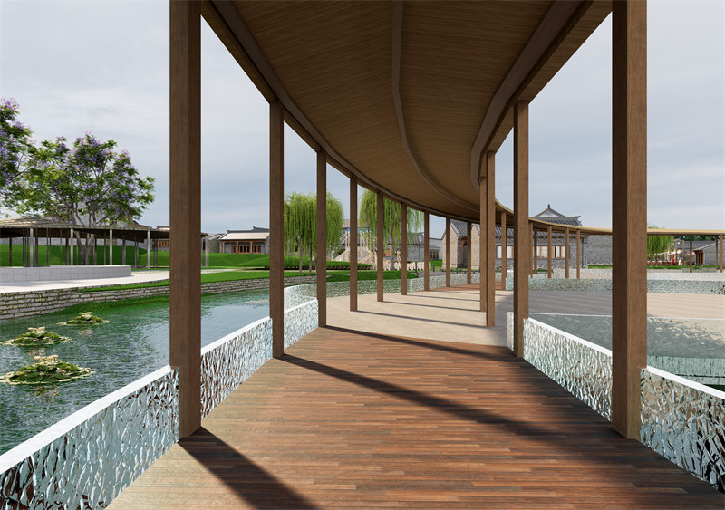 通过多次现场实地考察,我们发现,宋村的古建筑基本都分布于左江沿岸,且很多都保存的不是很完好,为了能够更好的保护古建筑,我们首先是想到了修缮古建筑,将古村更好的风貌展现出来,其次是将现代建筑融入古建筑群中,做到锦上添花。借此机会,我们成功的将传统建筑与现代建筑进行融合,进一步活化了古村的生命力,为游客提供更多的可以游玩,观光的场所。基于现场古村与江边有地势高差的缘故,我们便顺其自然,在原有高差的基础上,设计出一座观景桥,并利用这座桥,将各个观光景点串联起来,游客不仅可以在桥上远眺江上美景,还可以近观古建筑之美。古村内还有大量荒废的水田,我们将水田整合起来,形成一个湖泊,并且在湖泊边设计出观光步道,以方便游人娱乐,健身,游玩。
