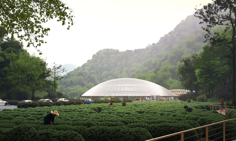 - 形态同构:建筑形态来源于月亮湾新月圆弧之形象,同时呼应与福建武夷山茶叶之形象,在概念上与场地文化呼应。