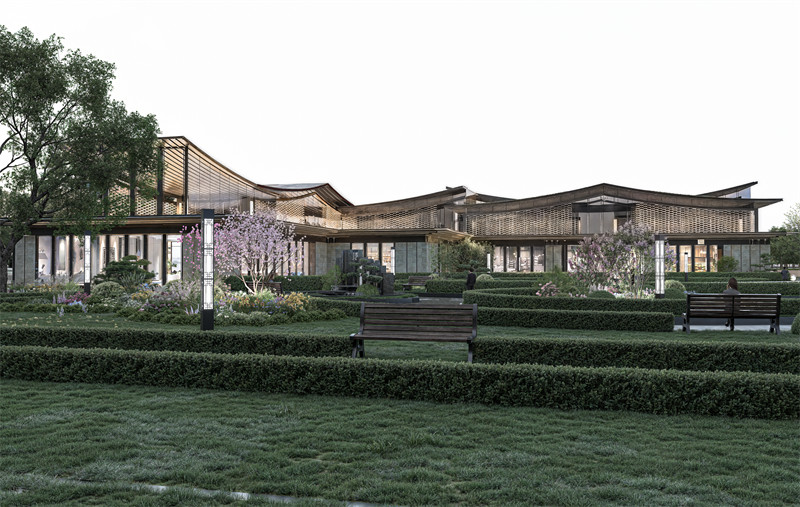 商务洽谈区:结合区位周边条件我们发现周围都为办公写字楼,对岸为洲际酒店,但是缺少一个环境较为优美的能坐下交流交谈事务的地方,于是我们结合原有场地风格,设计了一片以新中式为主题的咖啡厅茶厅,设有高级包厢方便商务人士交流,中间嵌套了一座新中式园林花园——隐·新中式花园(开放区域)。工作之余可以漫步于园林之中放松自我。提供了一片曲水流觞的优美和谐的场地。