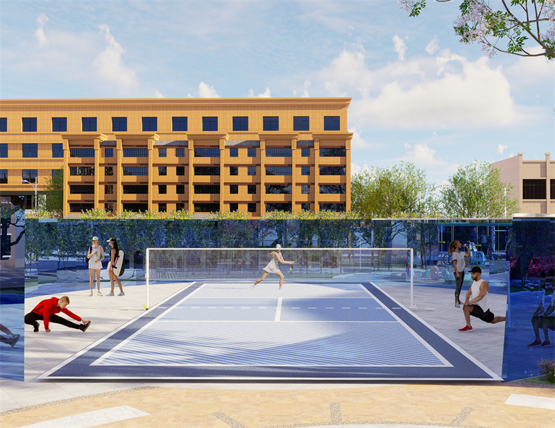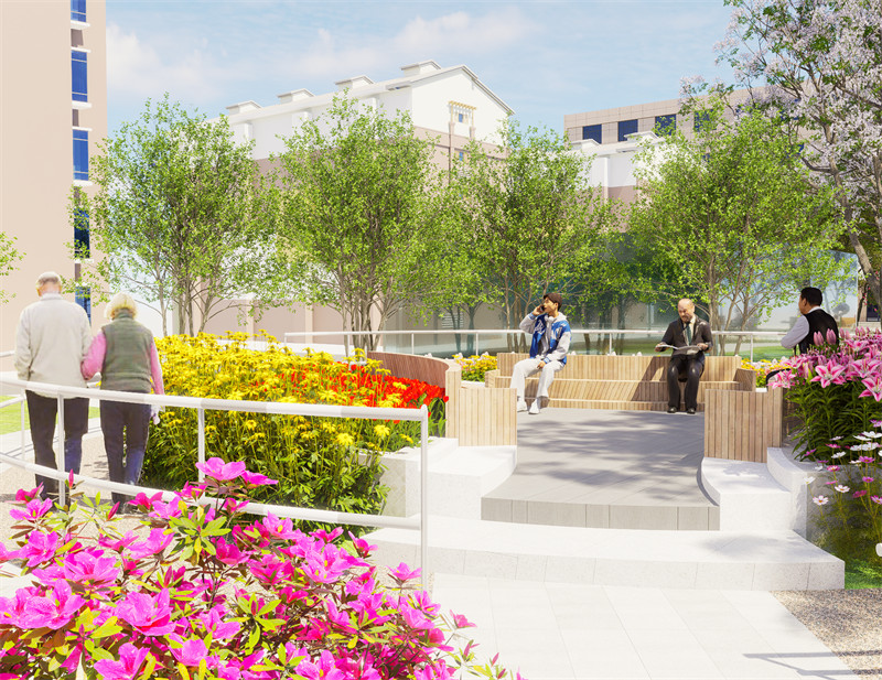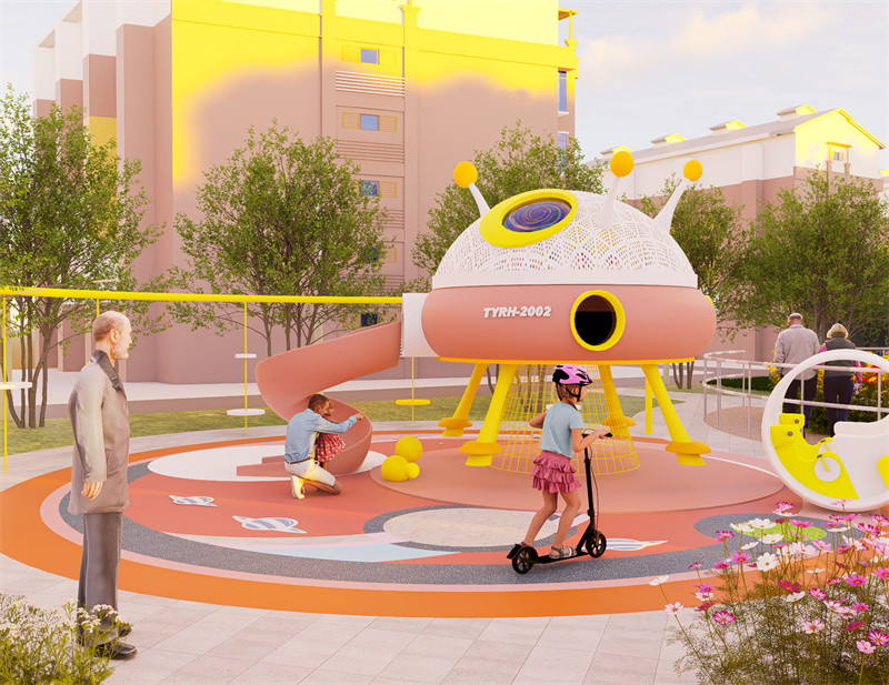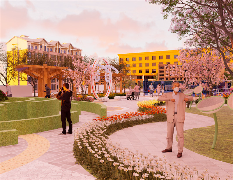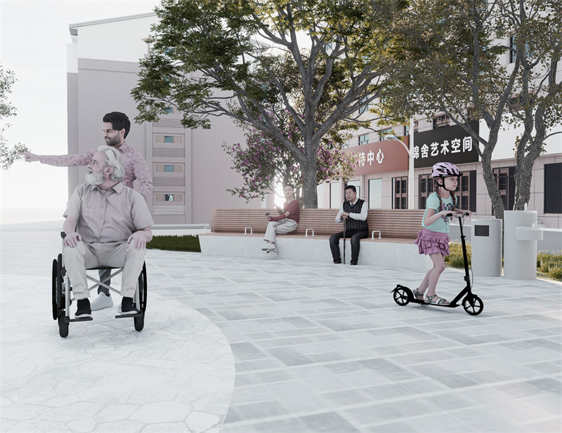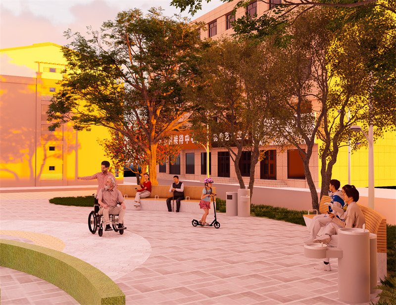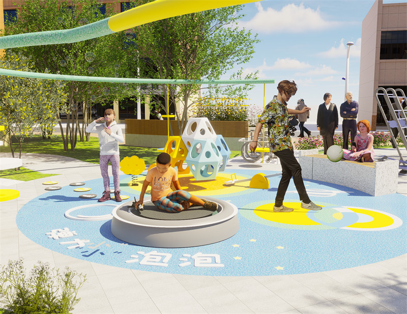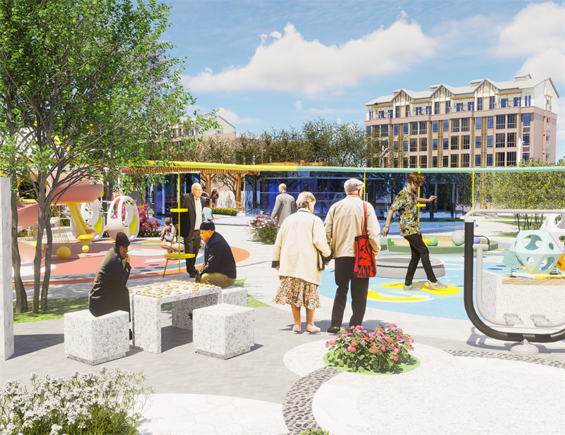 幼儿专属的娱乐场所则充满了童趣和色彩,滑梯、蹦蹦床、秋千、沙池等设施一应俱全,让孩子们在玩耍中锻炼身体,激发创造力。此外,该区域还设置了亲子互动区,鼓励家长与孩子共同参与游戏,增进亲子关系,在其中更是有个亮点之处——通过似“S”形推拉圆柱将场地连接起来,在其上更是设置了一些有趣的设施,增加场地的趣味性。在康养休闲区旁边设置了幼儿娱乐专属区,以便老年人在休憩娱乐的同时可以看护孩子,不会脱离自己的视线,促进代际交流,这种设计安排旨在提供一个平台,让老年人和幼儿能够在安全、舒适的环境中相互接触和交流。通过共同活动,他们可以增进了解,打破年龄隔阂,建立深厚的情感联系。这种代际交流有助于培养孩子们的尊老爱幼意识,同时也为老年人带来欢乐和陪伴感;增强社区凝聚力,通过老年人和幼儿在共同的空间内活动,可以增强社区的凝聚力和归属感,有助于构建一个和谐、包容的社区环境,使得不同年龄段的人群都能在这里找到归属感和幸福感。