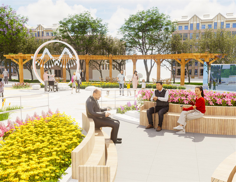 休闲设施:广场内设置了休闲廊架、象棋桌、休息亭等设施,为居民提供了休闲娱乐和社交的好去处。