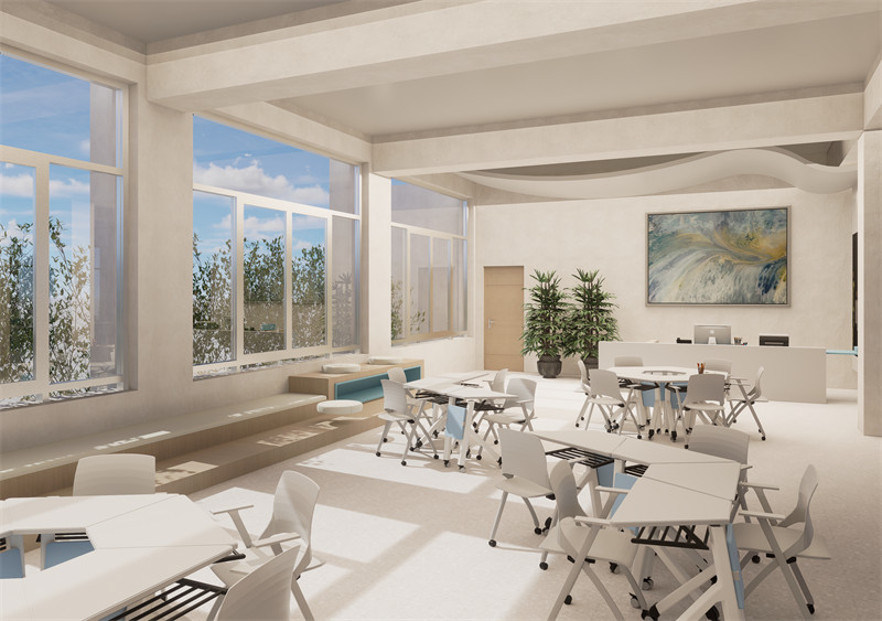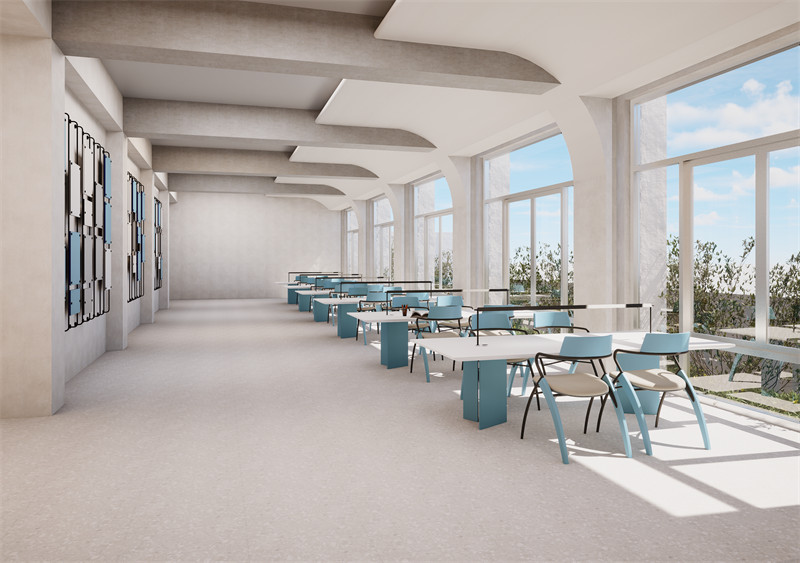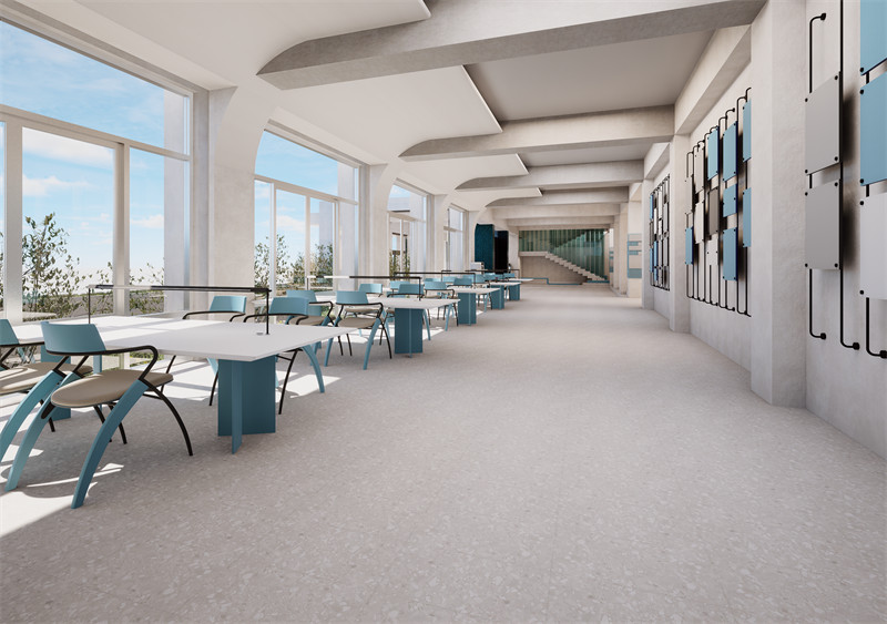 在细节设计上,我们充分考虑了师生的使用需求与审美需求。如通过设置导向标识、装饰性花窗等元素,提升了空间的辨识度与美观度;同时,在楼梯处理上采用了加固与美化相结合的设计手法,既保证了安全性又提升了观赏性。