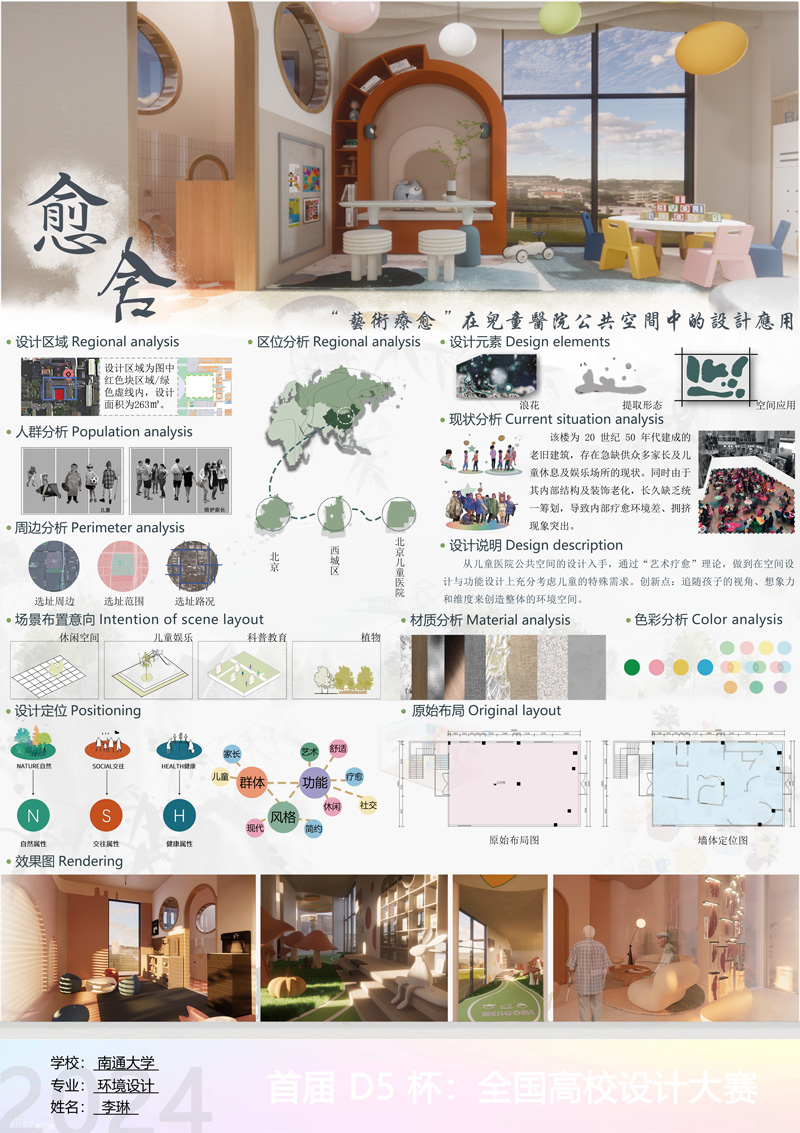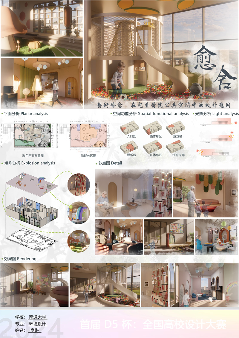 8.设计结论:通过分析研究,艺术疗愈应用到儿童医院公共空间环境中具有实践与理论方面的可行性。过精心的设计,有序融合各种不同的感官体验,以艺术强大的感染力和传达转移力能够较好地缓解患儿的恐惧心理,减轻其压力及焦虑情绪,使环境起到疗愈作用,从而缓解病情。基于艺术疗愈理念设计儿童医院公共空间,不仅满足儿童病患生理、心理需求,也激发了社会对于儿童医院公共空间设计问题的关注,具有深刻的思考意义。