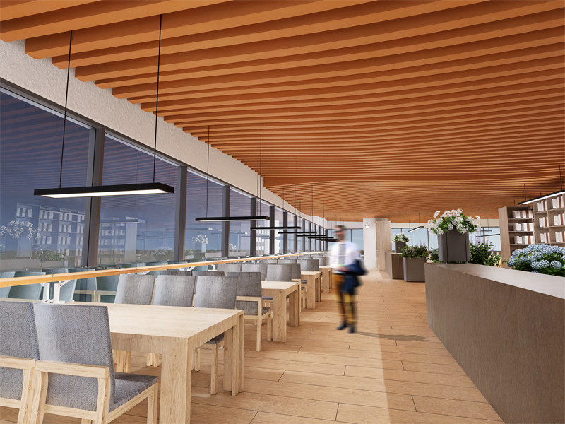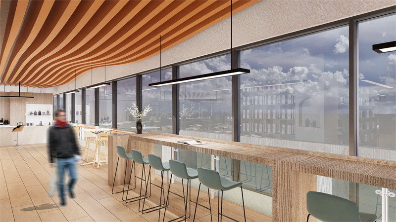 空间布局与环境营造:采用大空间、开放式的布局,减少隔断,墙面墙面以玻璃幕墙为主材,结合低辐射玻璃技术,提供开阔视野与自然采光效果。引入智能调光玻璃,适应不同光线需求,增强空间的舒适性与环境互动感。